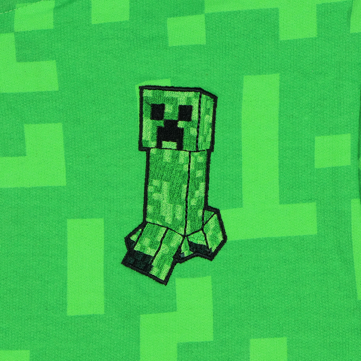 This boys' Minecraft Creeper zip-up jacket features an all-over pixelated green design and a mesh hood that extends over the face, showing the signature Creeper eyes. The zip front includes a character chest graphic and two functional side pockets. Made from a durable fleece blend, the inside lining provides warmth while remaining lightweight and easy to move in. Minecraft’s blocky world of exploration and strategy inspires gamers of all ages. This jacket lets kids express their interests while staying comfortable in a gamer-themed outerwear piece. With clean finishes, reinforced seams, and breathable fabric, it’s built to support regular wear while keeping the Creeper-inspired look intact.