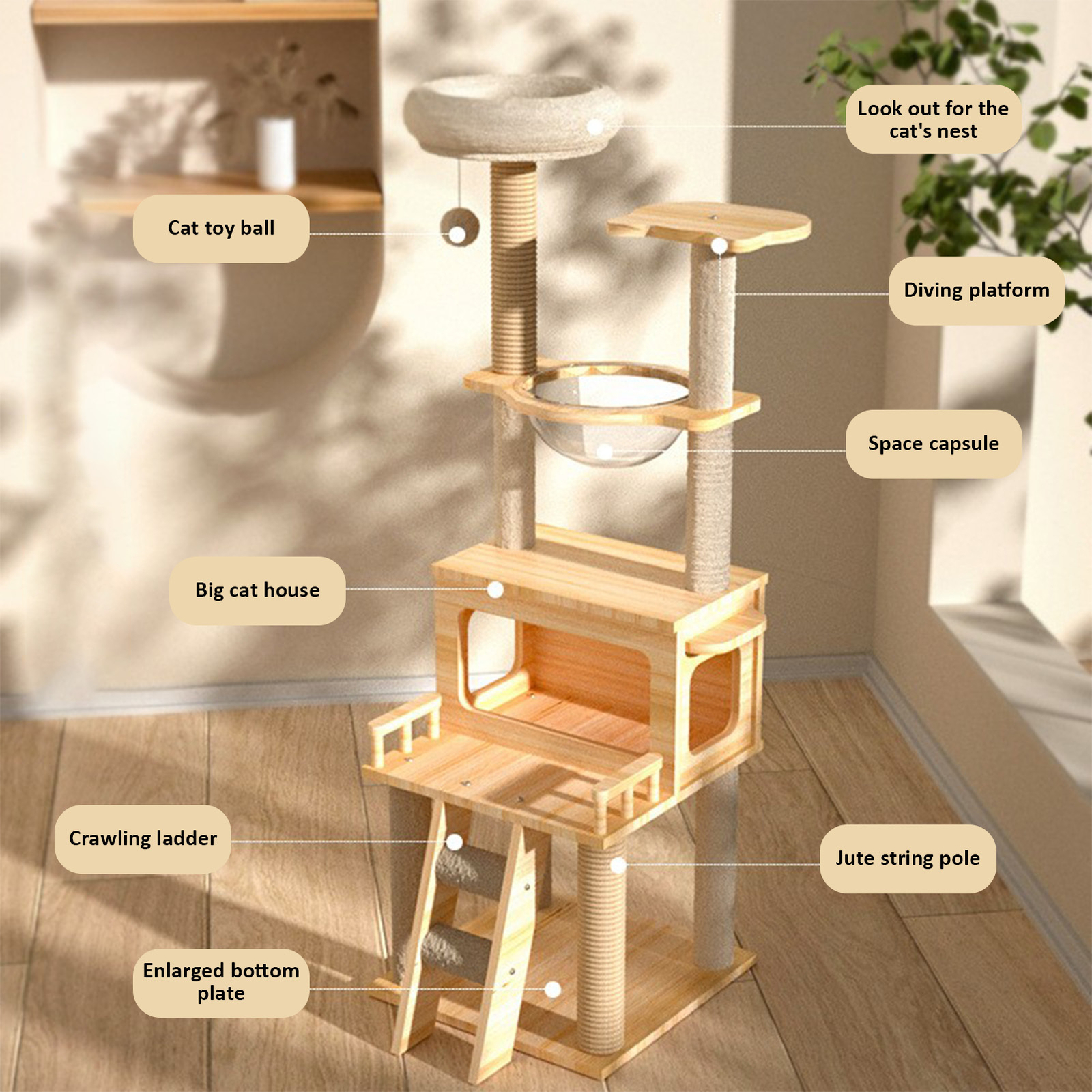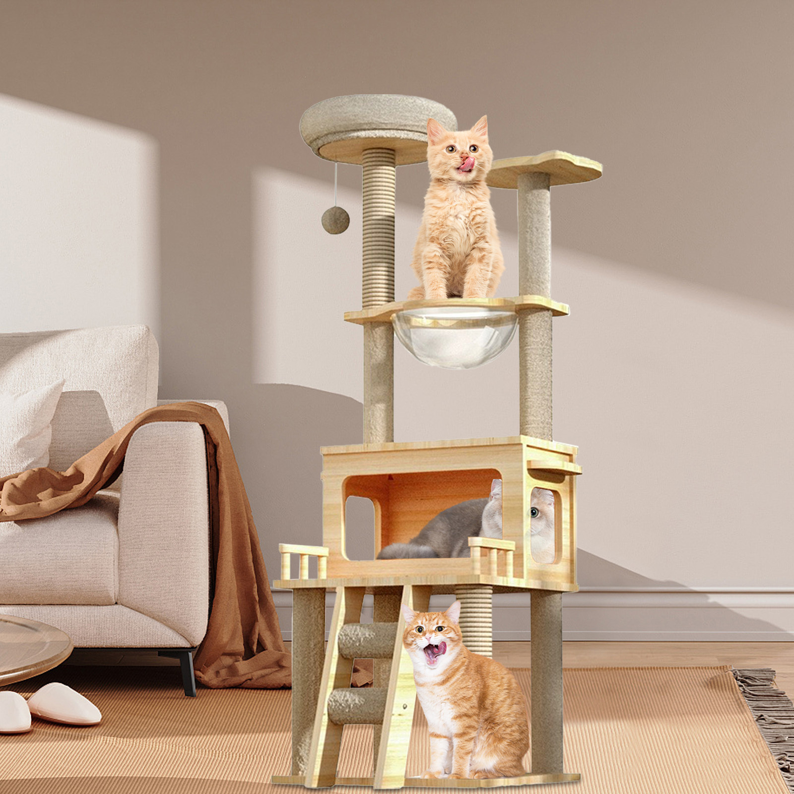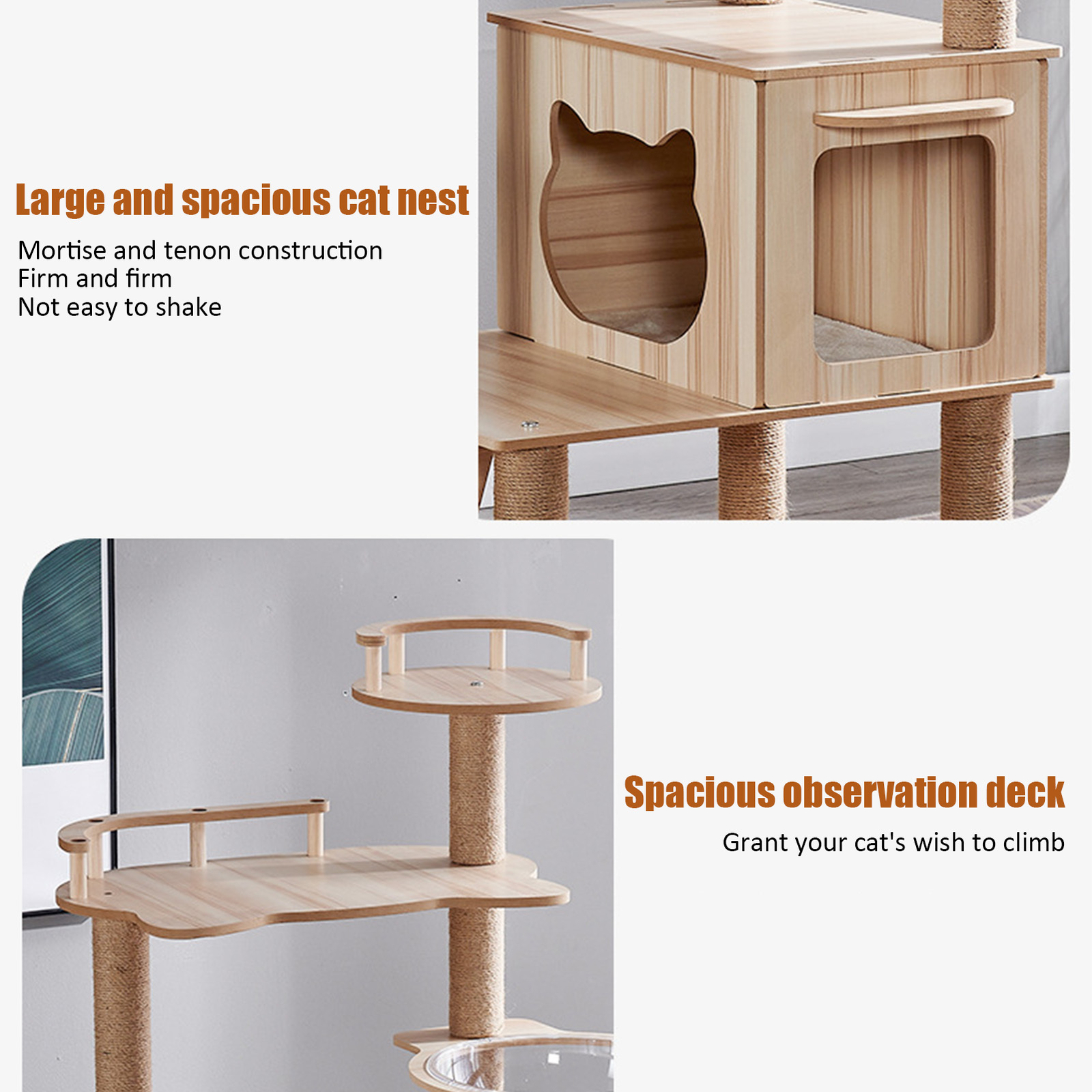 Sturdy Support: Crafted with robust MDF, this cat tree promises enduring stability and a sleek, modern design, ensuring a safe and stylish haven for your large feline friends.\nTop Perch: Designed with a top perch for panoramic views, multiple levels for exploration, and a cozy condo for restful retreats, this cat tree is a haven for large cats.\nCats Stay Active: With sisal rope scratching post wraps, this tree meets your cat's instincts and keeps them entertained, ensuring claws stay healthy.\nCozy Relaxation Station: Designed for large cats, this tree features a 360-degree clear spaceship hammock, providing a secure and elevated resting place where your cat can swing and stretch in comfort.\nClimbing Haven for Felines: Designed with multiple levels, this cat tree provides a variety of scratching posts at different heights, ensuring your large cat can stretch, scratch, and stay active.\n\nThis cat tree is perfect for large cats! With stability and durability, your pet will have a safe place to play and climb. The condo is great to snooze and hide, while the sisal rope scratching post keeps cat claws healthy and entertained. The scratching posts give your furry friend plenty of options to scratch, while the comfortable and relaxing resting place is perfect for your cat to rest after playtime.\n\n