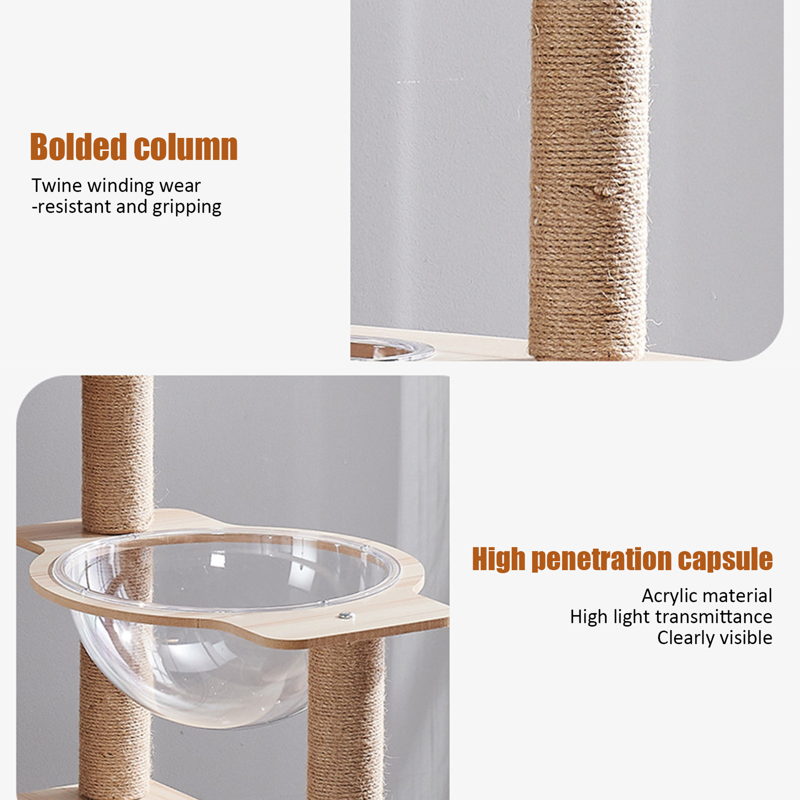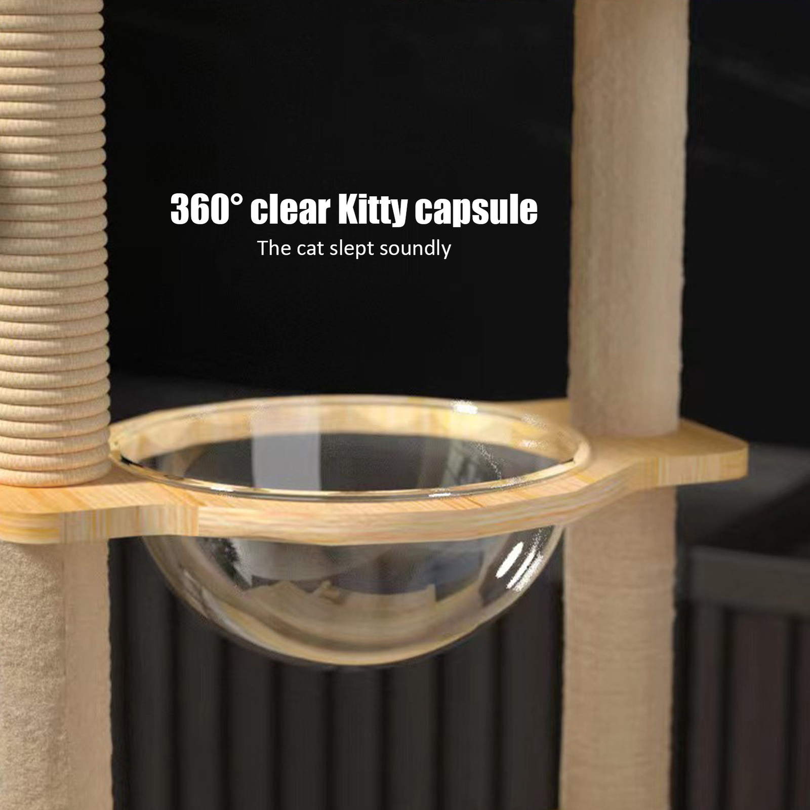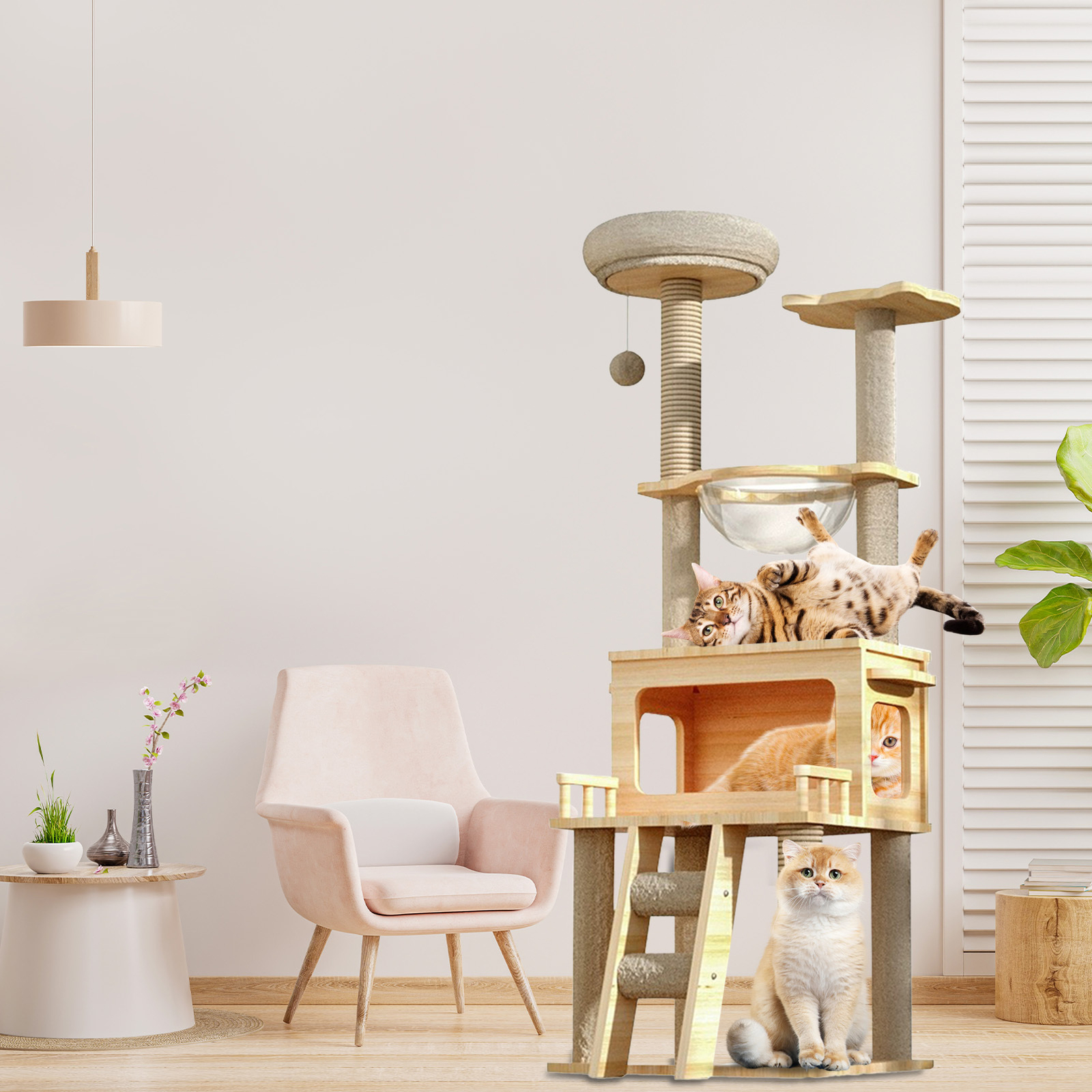 Sturdy Support: Crafted with robust MDF, this cat tree promises enduring stability and a sleek, modern design, ensuring a safe and stylish haven for your large feline friends.\nTop Perch: Designed with a top perch for panoramic views, multiple levels for exploration, and a cozy condo for restful retreats, this cat tree is a haven for large cats.\nCats Stay Active: With sisal rope scratching post wraps, this tree meets your cat's instincts and keeps them entertained, ensuring claws stay healthy.\nCozy Relaxation Station: Designed for large cats, this tree features a 360-degree clear spaceship hammock, providing a secure and elevated resting place where your cat can swing and stretch in comfort.\nClimbing Haven for Felines: Designed with multiple levels, this cat tree provides a variety of scratching posts at different heights, ensuring your large cat can stretch, scratch, and stay active.\n\nThis cat tree is perfect for large cats! With stability and durability, your pet will have a safe place to play and climb. The condo is great to snooze and hide, while the sisal rope scratching post keeps cat claws healthy and entertained. The scratching posts give your furry friend plenty of options to scratch, while the comfortable and relaxing resting place is perfect for your cat to rest after playtime.\n\n
