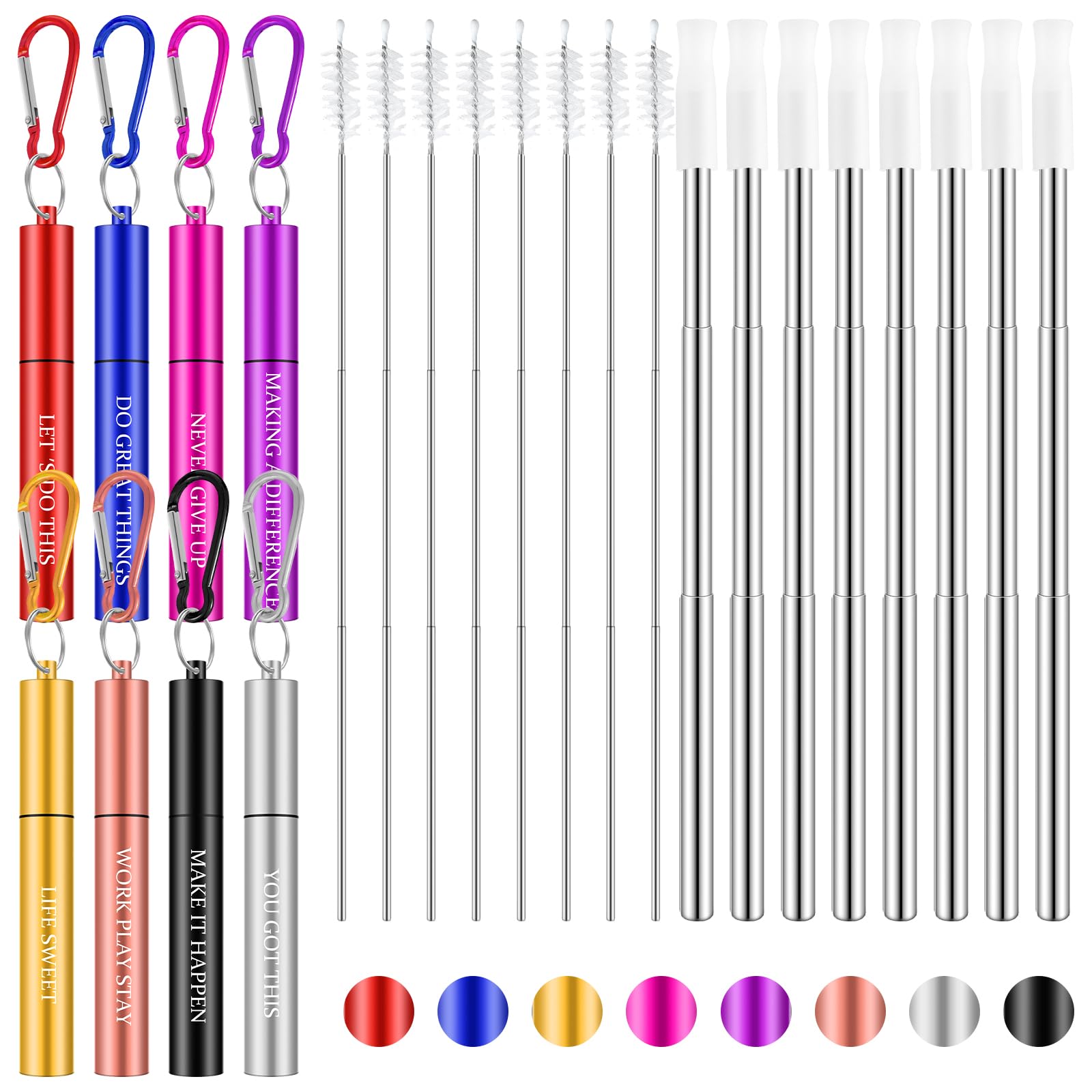 8 Pack Reusable Metal Collapsible Travel Straws Portable Stainless Steel Drinking Foldable Cruise Straw with Silicone Tip, Cleaning Brushes, Keychain for Travel Work Cruise Ship(Stylish Style)
