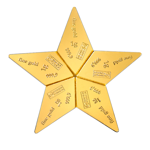 The 5 gram bar is pre-scored into 5 bars of 1 gram each. Each of the 1 gram bars is stamped with the weight and purity "1g fine gold 999,9" and the assayer's stamp "CHI Essayeur Fondeur".
