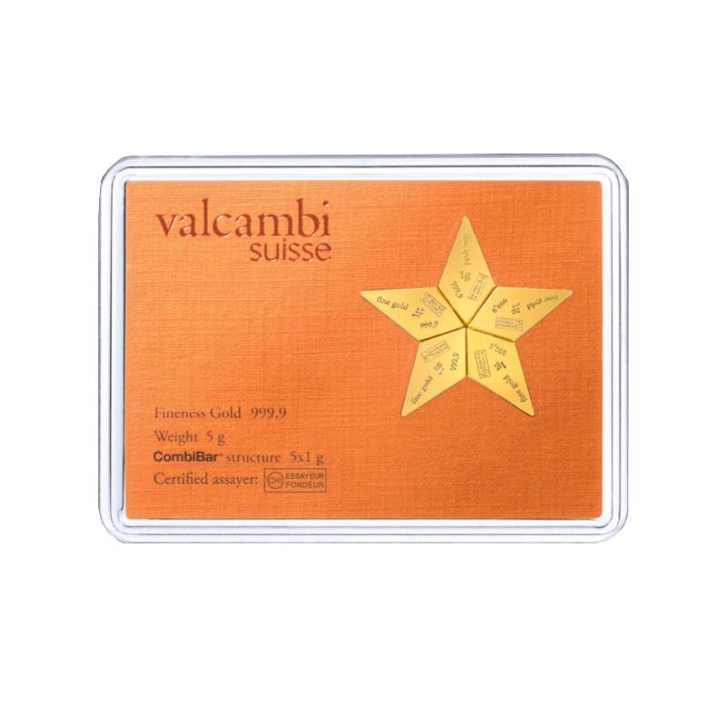 Valcambi Suisse 5x1 Gram Gold Star CombiBar (0.160754 oz) with Assay Card
