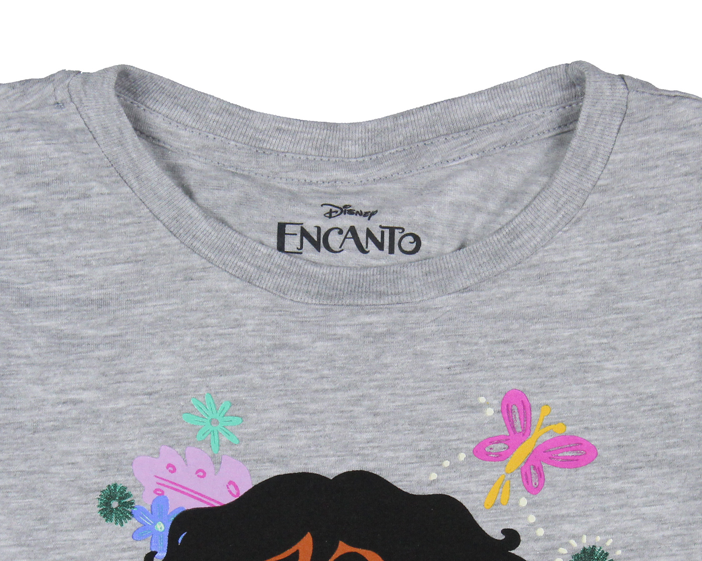 Embrace the magical world of Disney's Encanto with this enchanting Girls Mirabel distinctively Me Graphic Print T-Shirt. This light grey heather tee captures the essence of Mirabel as she twirls her hair with her finger, surrounded by vibrant butterflies and blooming flowers. Below her, the words "distinctively me" in a soft, light purple font add a touch of whimsy. Crafted with comfort in mind, this tee is made from a blend of 60% cotton and 40% polyester, ensuring a soft and breathable feel against the skin. The tagless design enhances the overall comfort, while the short sleeves provide a casual and relaxed look. This Disney product guarantees the amazingity and is great for young girls who love the enchanting world of Encanto. Let your child express their individuality and embrace their distinctiveness with this charming Mirabel distinctively Me Graphic Print T-Shirt.