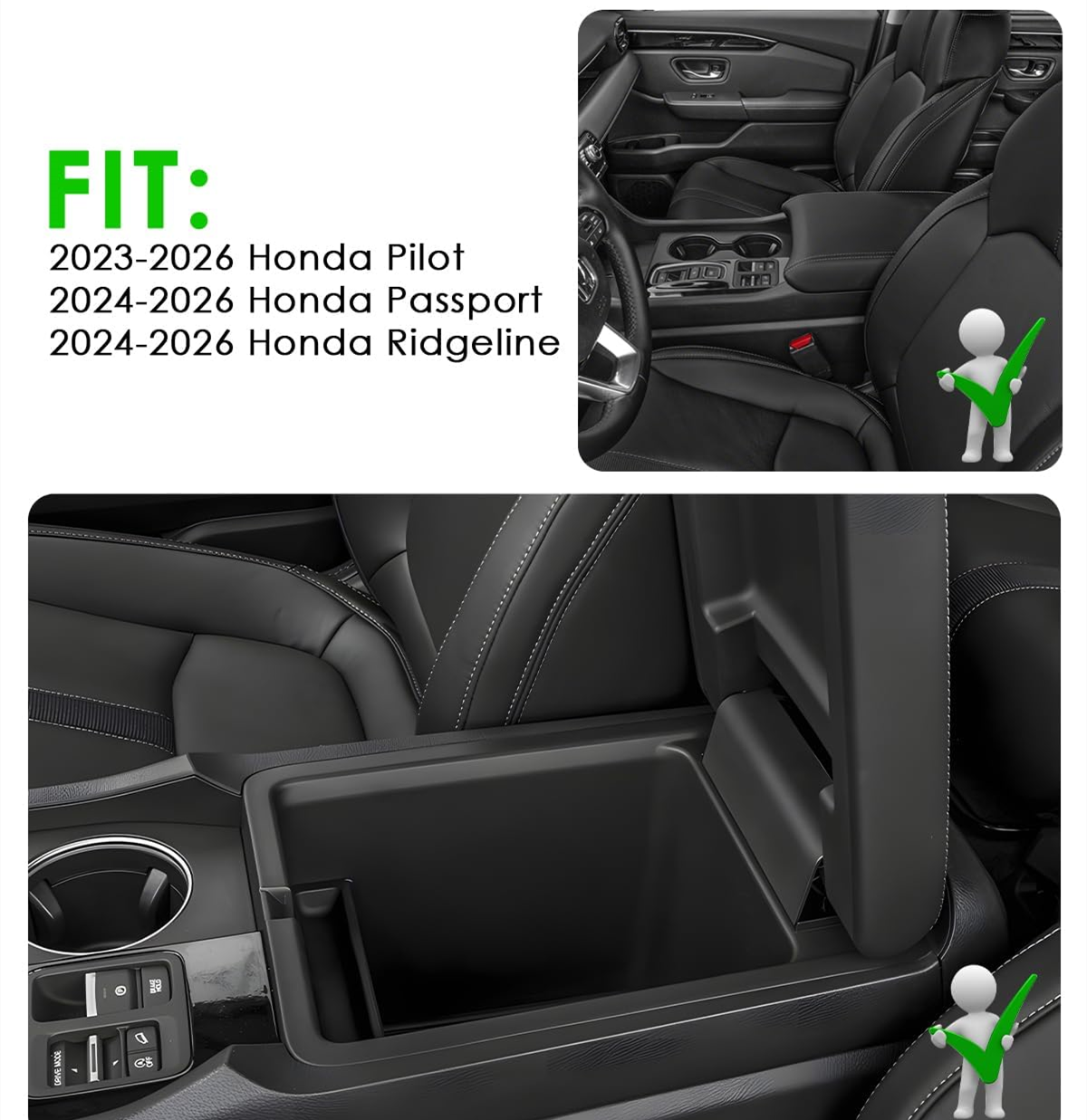 • PATENTED DESIGN - The center console organizer is only compatible with 2023 2024 2025 2026 Pilot (LX, Sport, EX-L, TrailSport, Touring, Elite); 2024 2025 2026 Ridgeline (Sport, RTL, TrailSport, Black Edition); 2024 2025 2026 Passport (EX-L, TrailSport, Black Edition) .This matches the internal shape of the center console. And it doesn't interfere with opening/closing the console lid.
