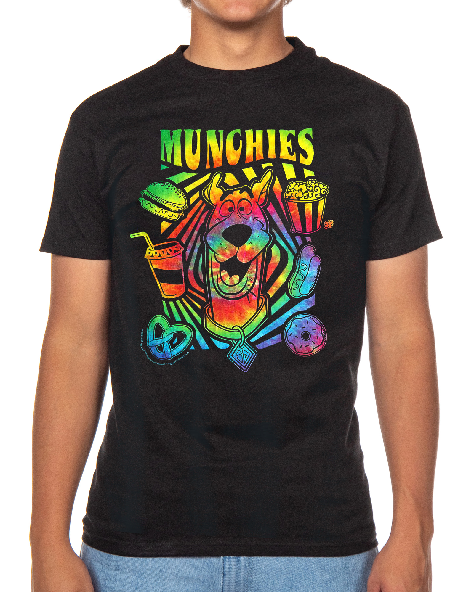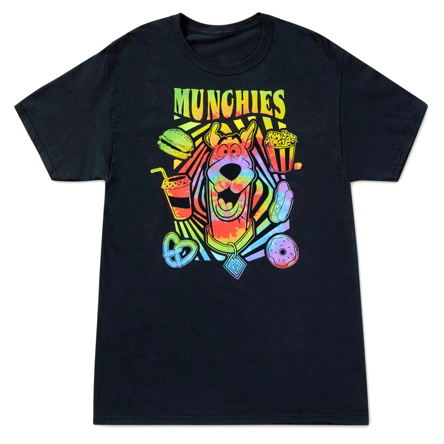 Celebrate your love for Scooby-Doo with this black t-shirt featuring a vibrant tie-dye graphic print. The graphic showcases Scooby-Doo surrounded by his favorite snacks, including hamburgers, popcorn, and pretzels, with the playful “Munchies” text above. The bold tie-dye colors stand out against the black background, making the design truly pop.
