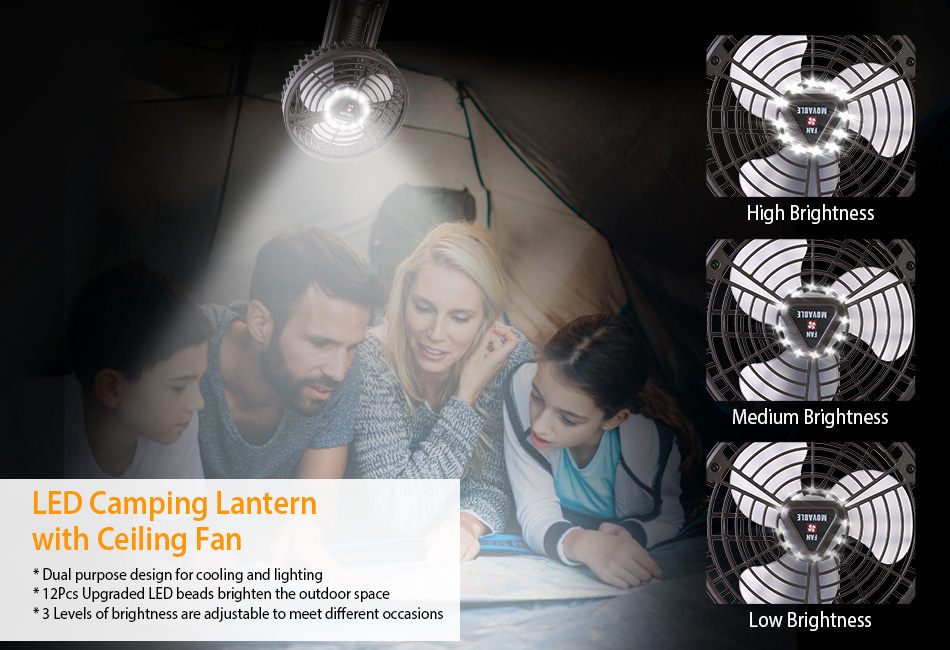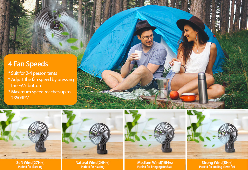 - *4 Fan Speeds:Deliver strong wind,cool wind,natural wind and low speed wind for camping,hiking,adventure,outdoor work,car repair,office,bedroom and survival kit. Our tent ceiling fan can work separately or combine use of lighting,suits for different working scenarios.