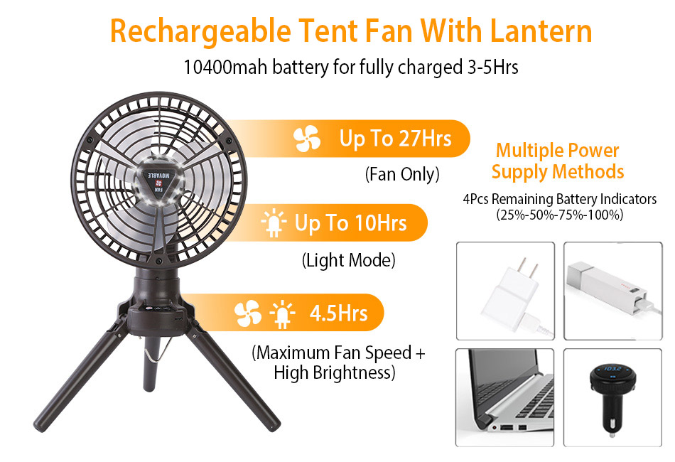 - *27Hrs Ultra-Long Runtime:Come with 10400mah battery and Type C charging cable,this rechargeable fan is powered by USB which can be compatible with a PC,laptop,car charger or any other USB outlet. Whether you are indoor or outdoor,you can flexibly choose the right way to charge it. 4 Indicator lights can tell you the remaining battery. It is an ideal companion for camping,fishing and hiking!
