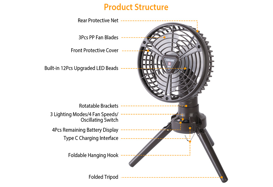 - *Auto Shaking Fan:The head of the USB fan can tilt 180° up and down,and this camping fan can oscillate 270° by pressing the DIRECTION button. Everyone can enjoy the coolness brought by the fan from many angles. Also the fan can automatically returns to positive after shutdown. This travel tent fan housing is made of sturdy ABS material,which can prevent violent impact and make you feel at ease to use it on various outdoor situations.