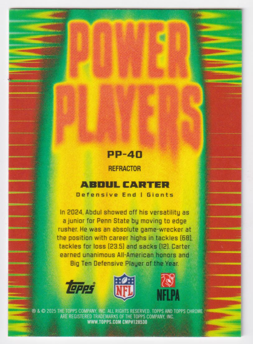 2025 Topps Chrome Power Players Refractor Abdul Carter Rookie New York Giants