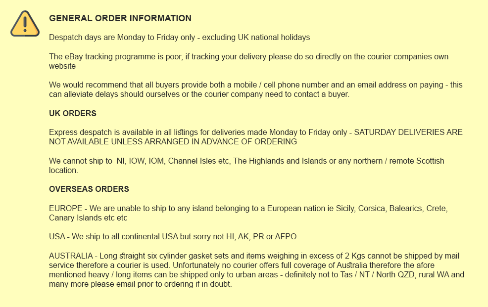 UK mainland deliveries will be made with Royal Mail, however multi item orders, large gasket set, head bolts, timing chain kits and high value items will be dispatched by courier.