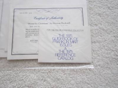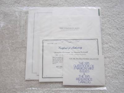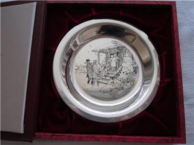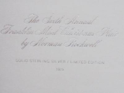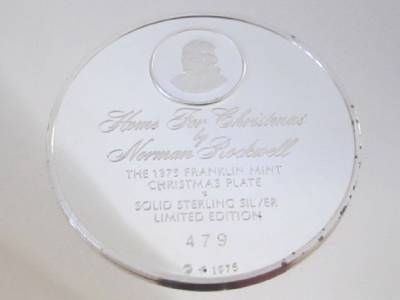 HOME FOR CHRISTMAS 925 STERLING SILVER PLATE IS IN MINT CONDITION AND THE FINAL ISSUE IN A SERIES OF SIX LIMITED EDITION CHRISTMAS PLATES DESIGNED BY NORMAN ROCKWELL. DISTRIBUTED IN 1975 BY FRANKLIN MINT THIS HIGHLY COLLECTIBLE ITEM BEARS THE SERIAL NUMBER 479 AND INCLUDES THE CERTIFICATE OF AUTHENTICITY, REFERENCE PAMPHLETS AND MAINTENANCE GUIDEBOOK. PLATE IS PROVIDED WITH ORIGINAL RED LIBRARY PRESENTATION BOOKCASE AND HAS RED VELVET COVERING ON THE INSIDE. PLATE MEASURES 8 INCHES IN DIAMETER, THE CASE MEASURES 10.5 BY 10.5 INCHES. THE PLATE WEIGHS 176.5 GRAMS.