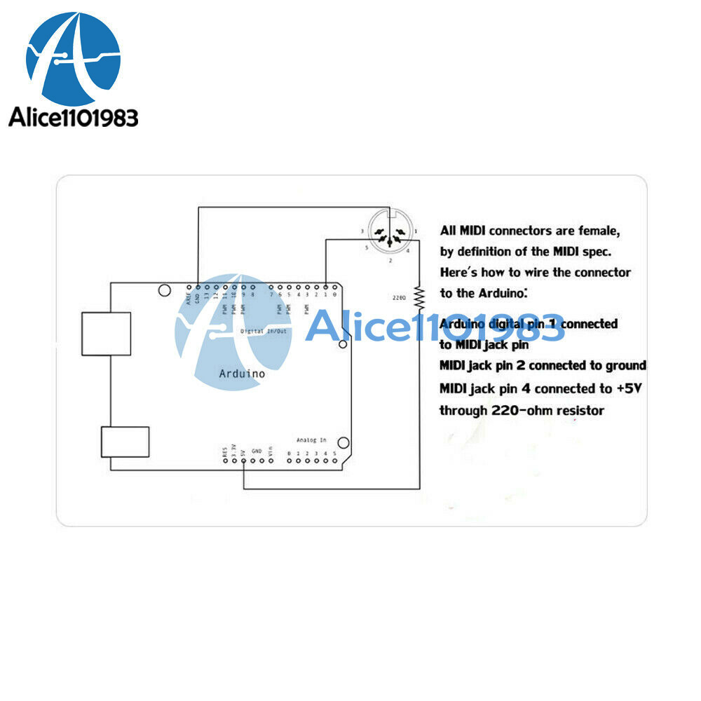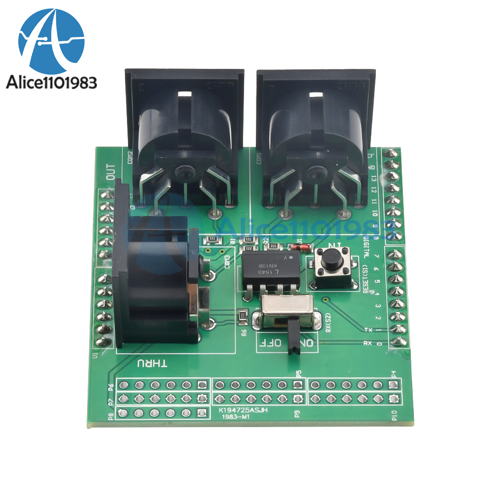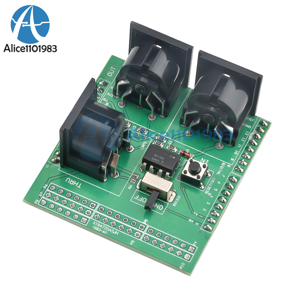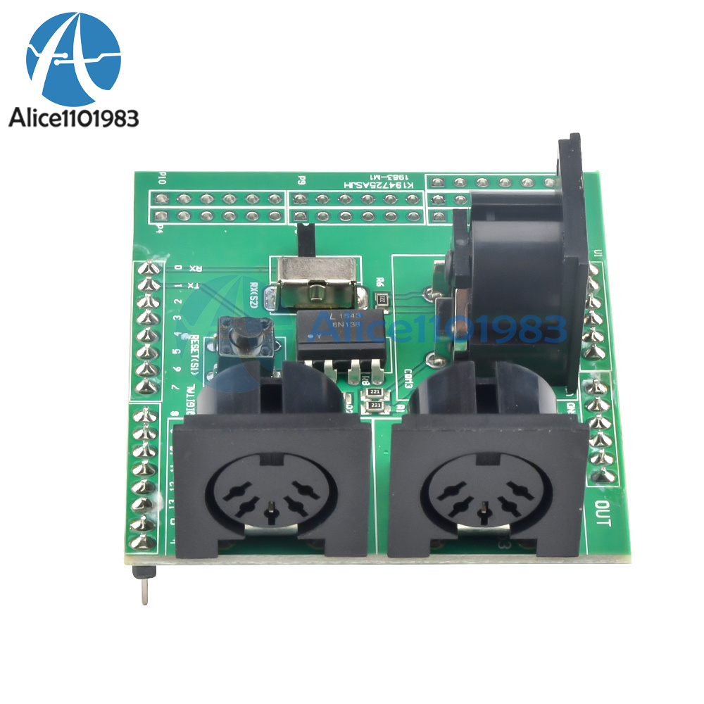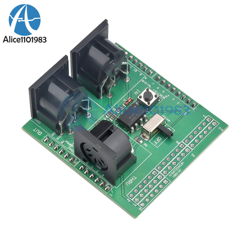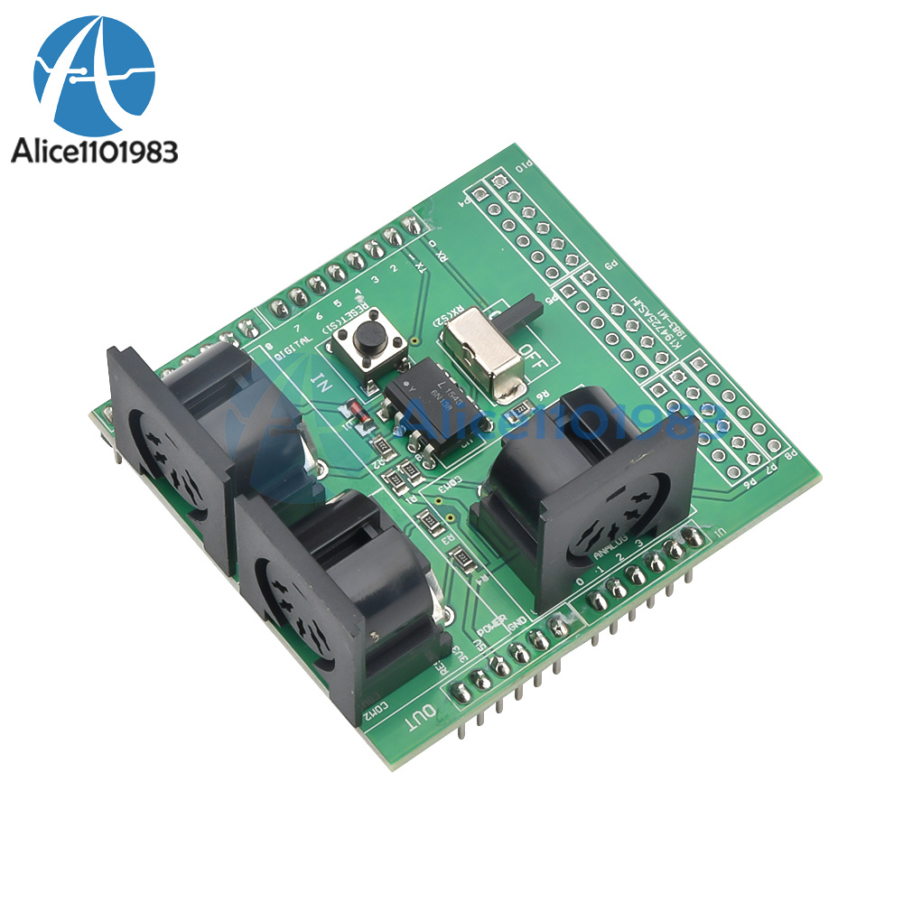 Through the MIDI adapter plate, your Arduino board or other microcontrollers can be accessed to powerful MIDI communication protocol. MIDI protocol and asynchronous serial interface has many similarities, so users can use the micro-controller UART pin to send MIDI event information. MIDI adapter plate provides MIDI - IN and MIDI - OUT connection, and MIDI THRU port. MIDI - port is light IN isolation, to prevent the ground loop. MIDI adapter plate can be installed directly like a shield at the top of the Arduino board: connect MIDI - IN/THRU to for Arduino hardware RX pin, connect MIDI - OUT to TX. It Arduino data and analog pin, power bus and the bus can transfer out. The RUN/PGM switch can let users on the forArduino board serial port programming, without having to remove the board. Note: the three hole MIDI connector no welding on the MIDI adapter plate, but these connectors included in this product.