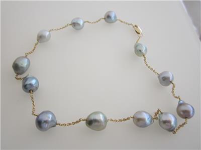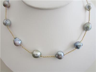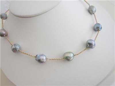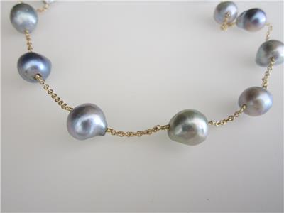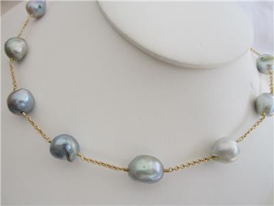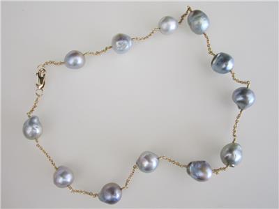 18 inch long Tin Cup necklace is new with 12 gray pearls stations. Pearls are baroque shaped and measures 10 millimeters on average, some are larger and display good luster. The 14 karat yellow gold chain is 1.5 millimeter thick and fitted with a large lobster clasp.