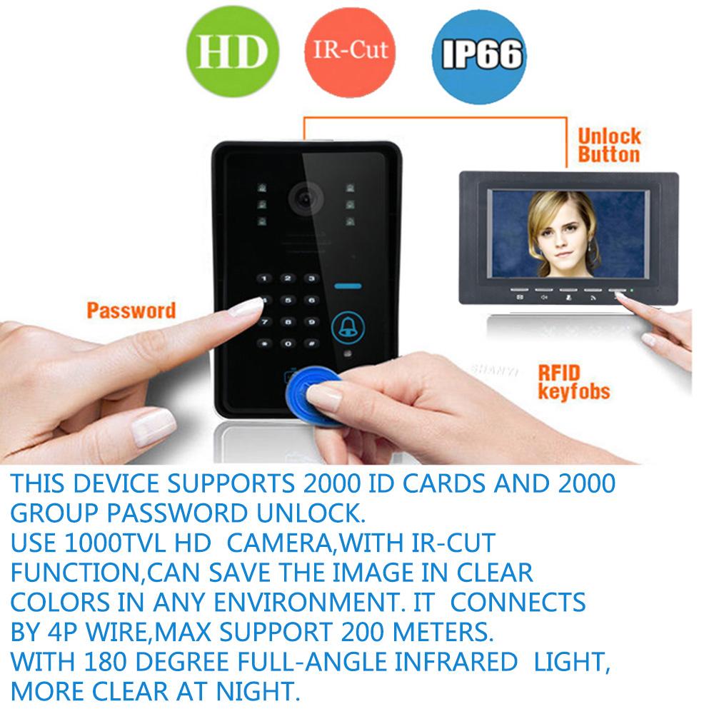 7" RFID Password Video Door Phone Intercom Doorbell With IR Camera 1000 TV Line Access Control System