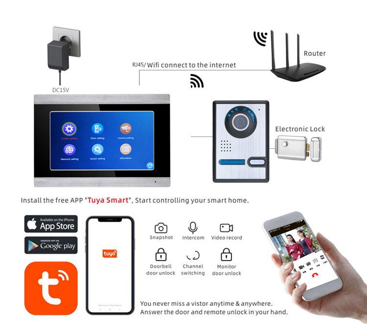 Easy installation by yourself with the adapter and cable we provided in this kit,outdoor unit can connect to indoor monitor by wired 4P cable.When indoor monitor connected to your wireless wifi router,you can connect mobile phone to indoor monitor,then mobile phone also can record video or open the door etc.Widely used in villas, apartments, houses, hotels, offices, public buildings and so on.