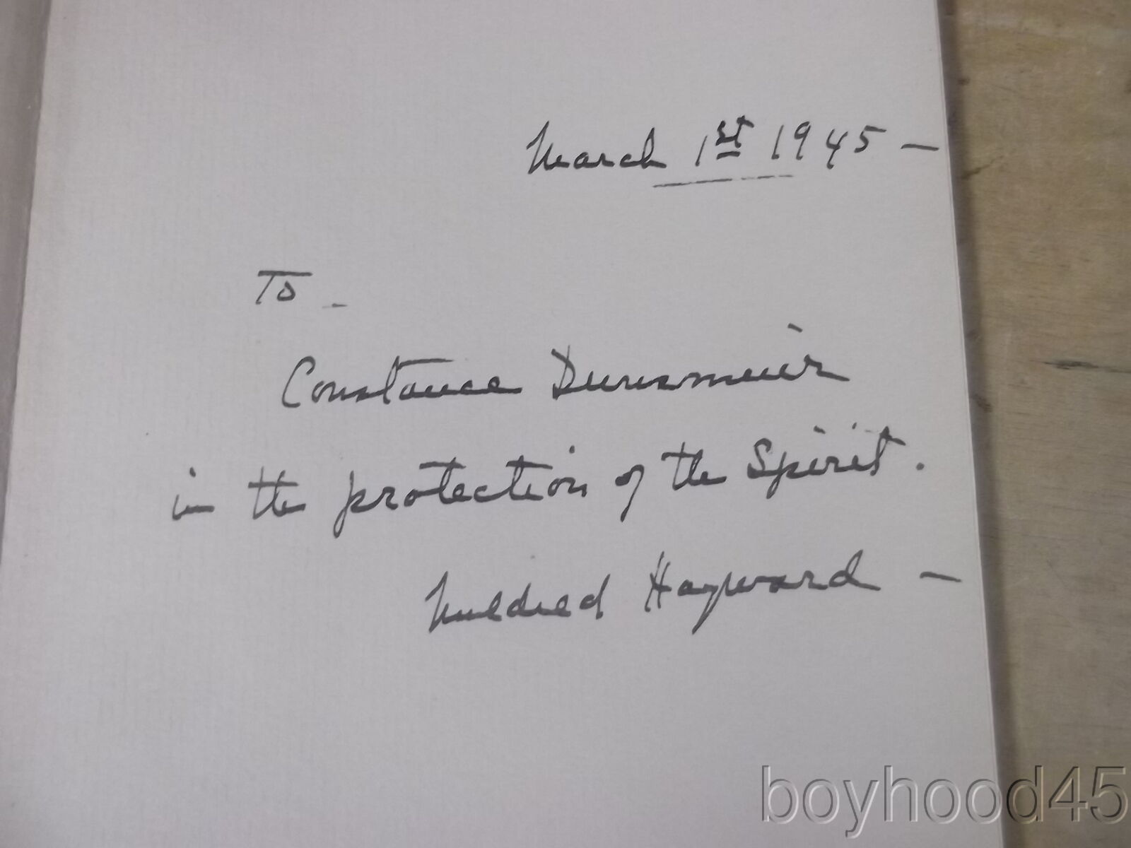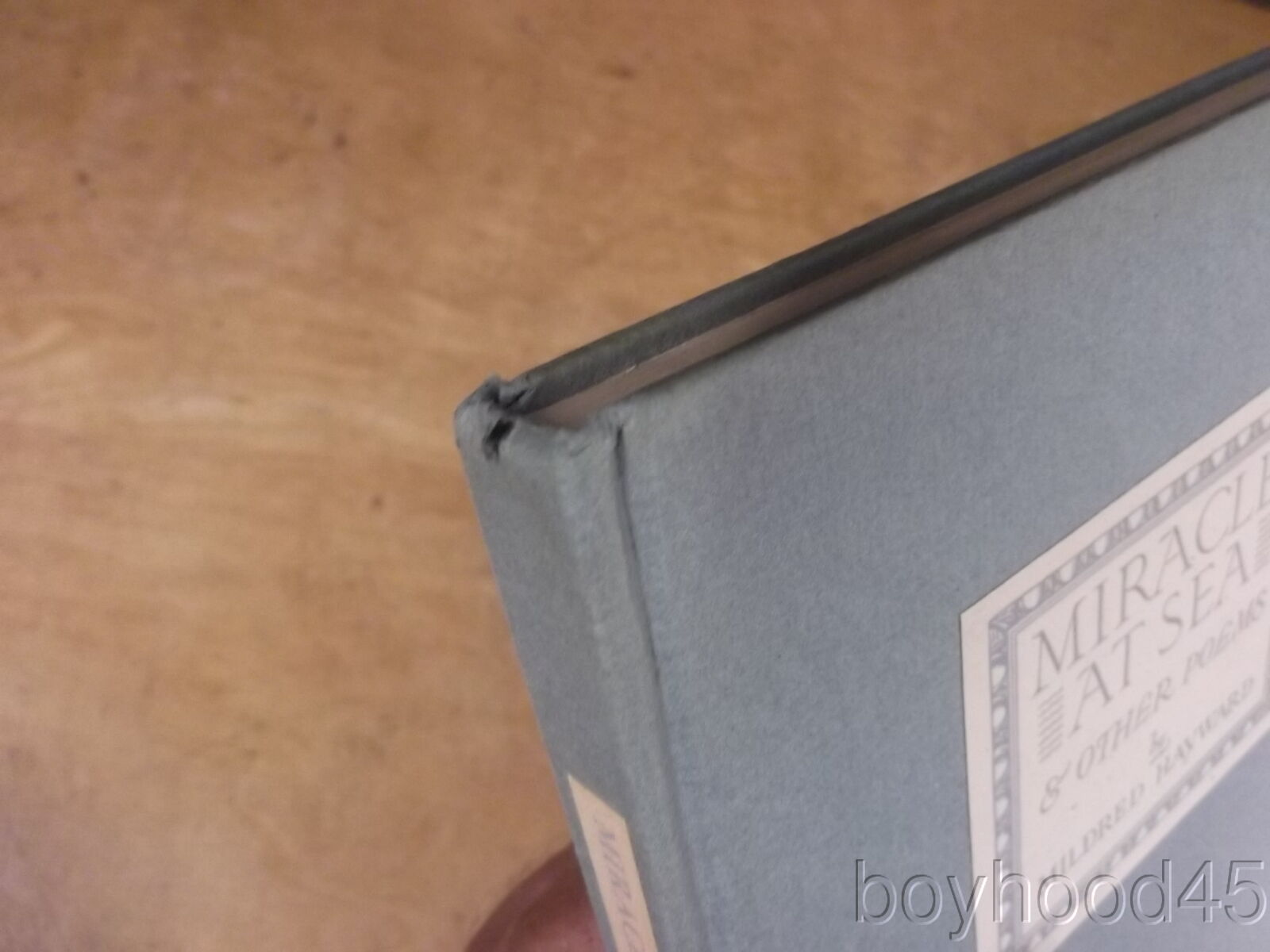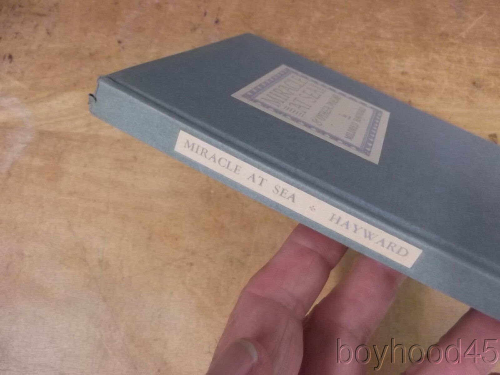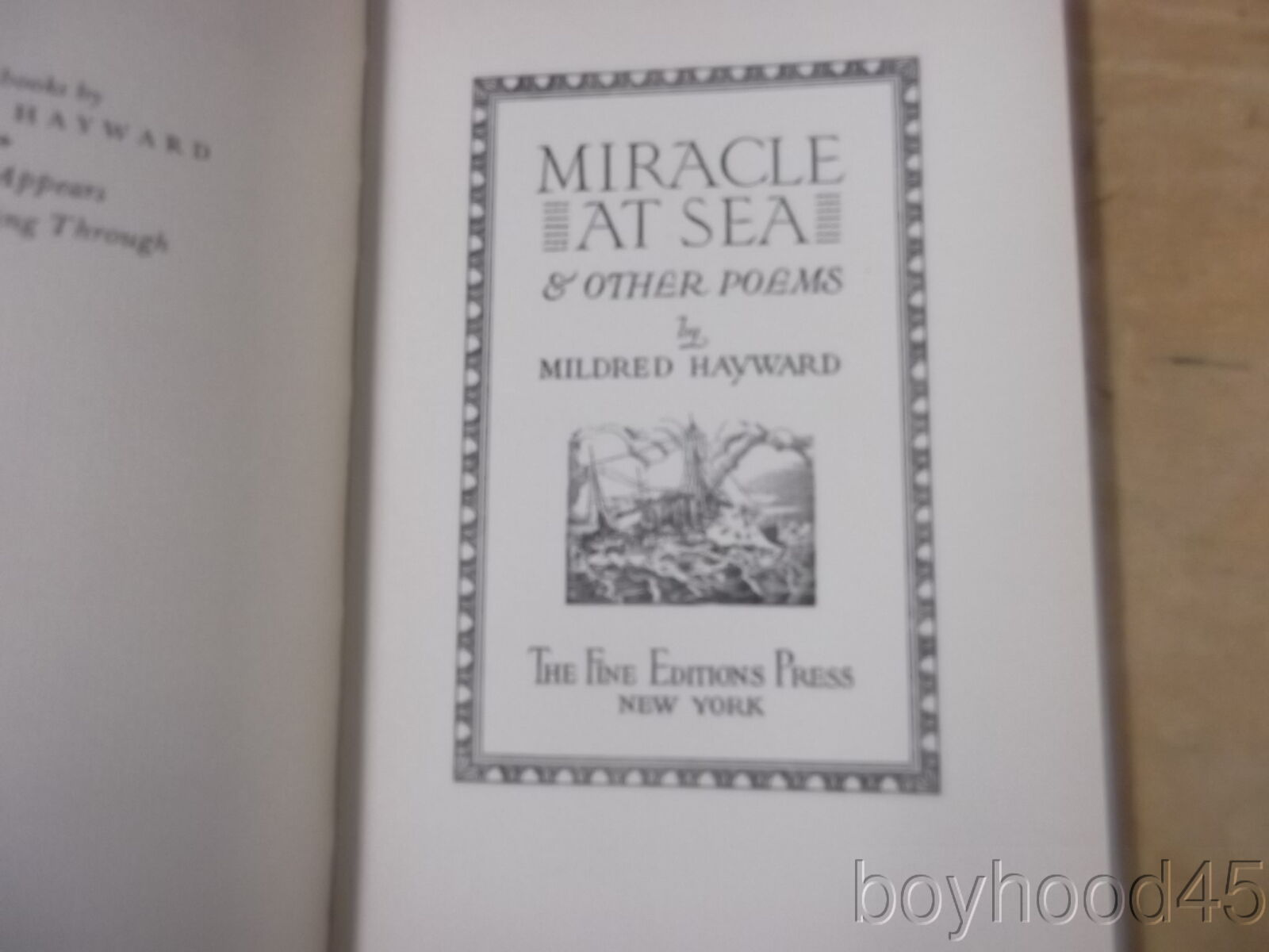 This is "Miracle at Sea & Other Poems" by Mildred Hayward. Published by Fine Editions Press, NY, 1943. First Edition. THIS COPY IS SIGNED BY THE AUTHOR IN A NOTE ON FRONT ENDPAPER. Lacking the dust cover, but flap from dust cover is adhered to front endpaper. Book is in Near Fine condition--small chip to head of spine, otherwise an excellent copy!! Clean, tight. The book measures 5 3/4 X 8 3/8, 85 pages. I have located JUST ONE OTHER COPY of this work in all of my internet searches and it is being offered for $50!!! I will offer this nice, SIGNED copy for only $35.00 plus $3.00 S&H in the US. Shipping costs to Canada will be considerably less than the general international rates quoted. Thanks for shopping mellowpagesrarebooks.com