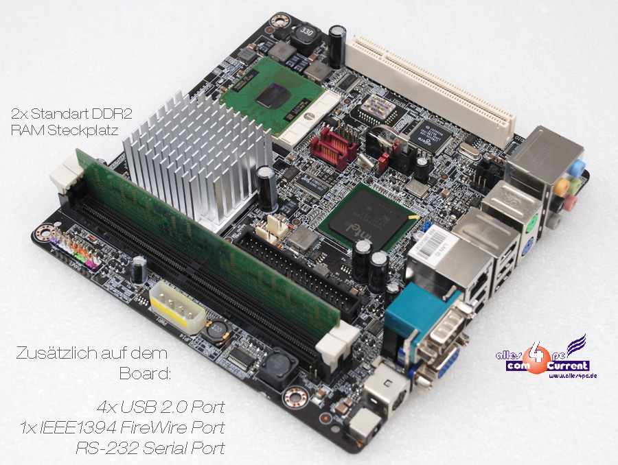 CPU Intel ist ein Centrino 1600Mhz, mit Passivkühler, 512 MB RAM. Auf dem Board befinden sich 2x SATA Anschlüsse, daher kann man SATA Festplatten oder DVD Laufwerke anschliessen,