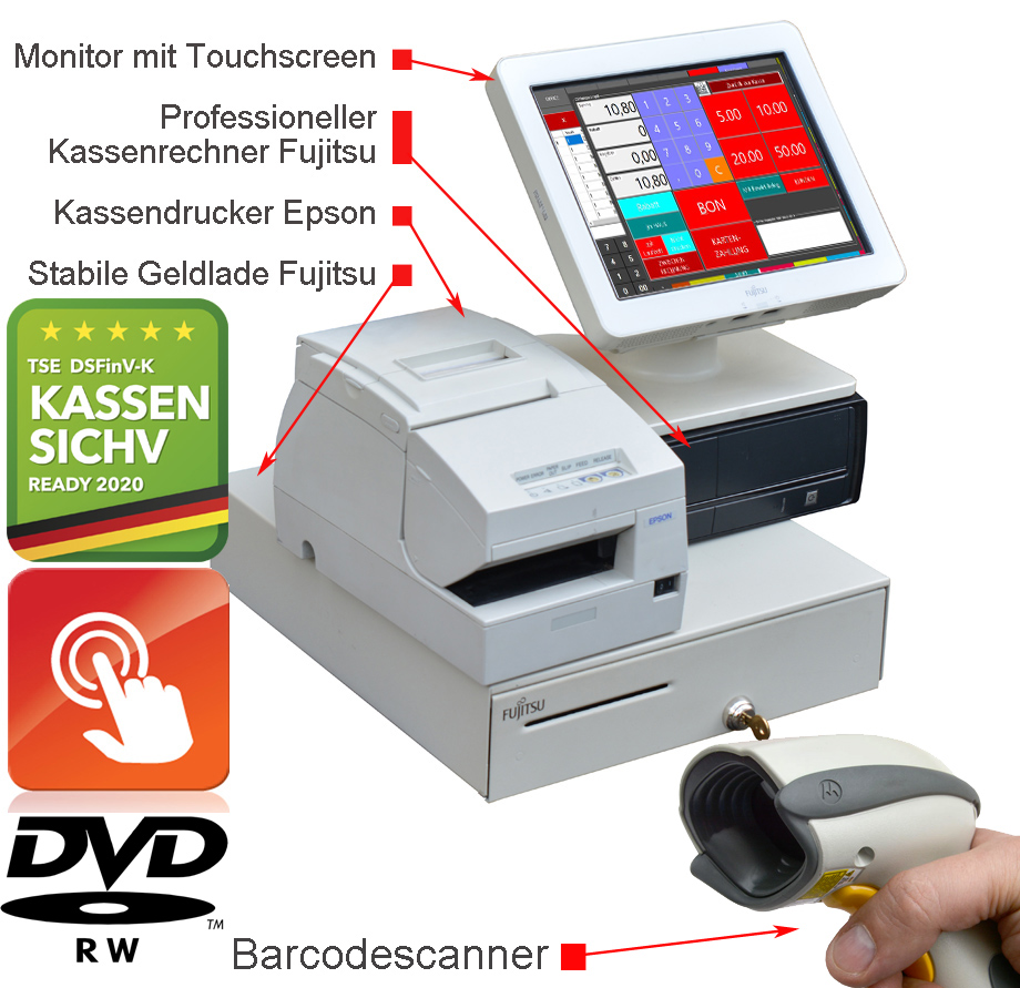 professionelles Fujitsu Kassensystem - Kassen-PC mit powered USB und RS-232, mit dem hochwertigen 30cm 12" Fujitsu USB TouchScreen Kassenmonitor, einem schnellen Kassendrucker Epson TM-H6000, SSD SATA Festplatte, 1D + 2D Scanner Motorola / Zebra,