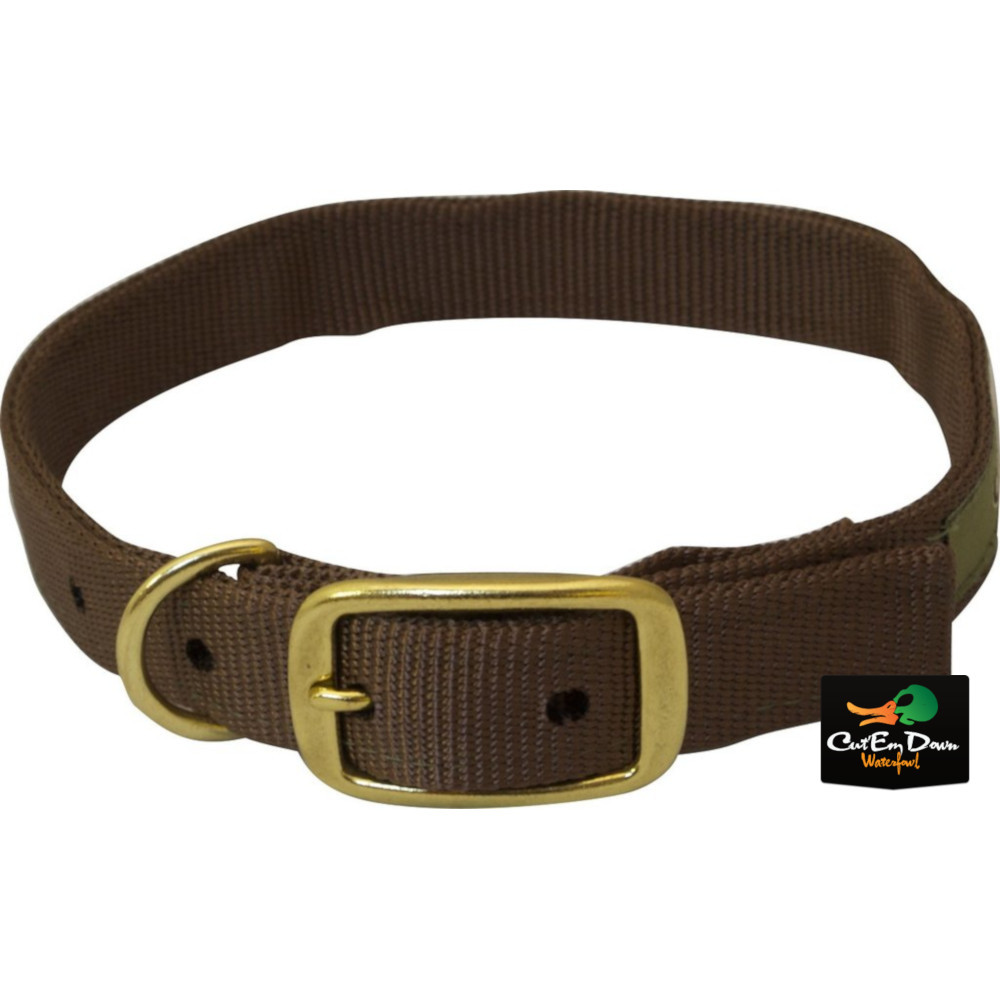 Heavy-duty dog collar constructed of durable nylon webbing and brass hardware. Available in various sizes for a custom fit.