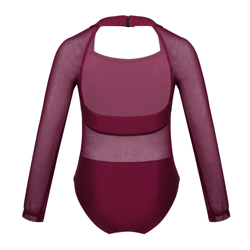 Mesh long sleeves, special neckline design with clasp closure. Mesh splice at back waist and two sides.
