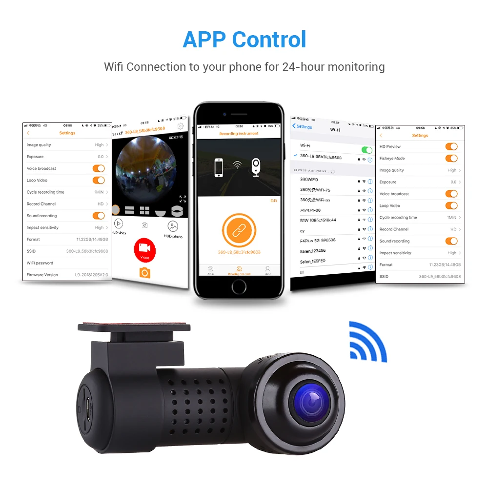 Main Feature: - 360 degree wide-angle real-time monitoring - 1080P 30FPS Full HD - Sony IMX326 High Sensitivity Image Sensor - Bulit-in G-sensor for emergency recording - Support 30m free Wifi link to support video replay and download - Hardwire with Fuse Kit