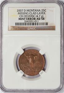 You are bidding on a 2007 D NGC AU58 Missing Clad Layer Montana Quarter Mint Error Extra Rare Date. Errors are becoming very rare as the mint has put in systems in 2002 to virtually stop all majors errors from getting out of the mint. Please check my very positive feedback. Shipping and handling $2.95. Please check out my other ERROR COIN Auctions this week.