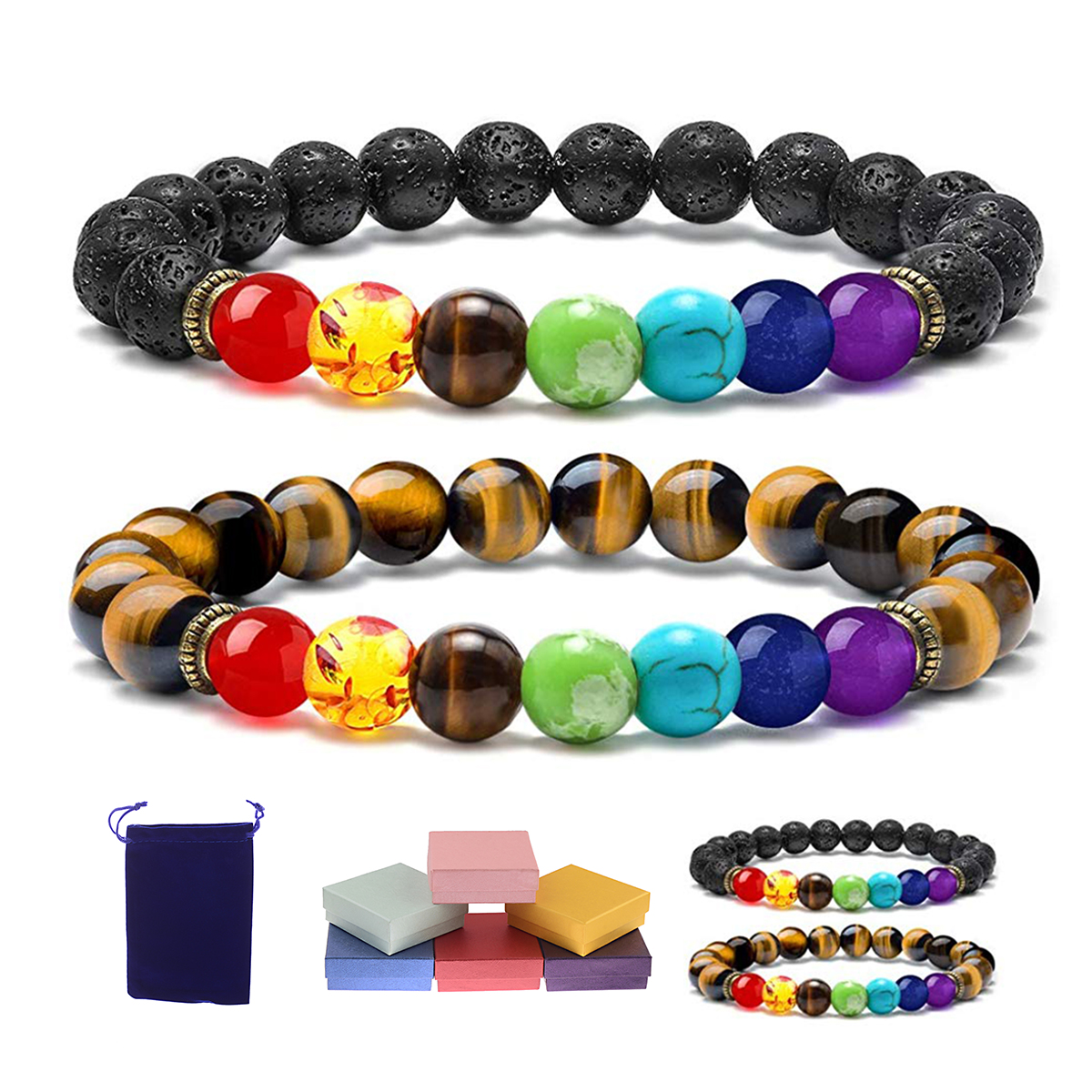 CHAKRA BRACELET SIZE: All chakra tiger eye and lava rock stone bracelets are made of 7 chakra beads and dozens of tiger eye lava rock stone beads, the inner length is approx 7 inch, perfect for gifts, for mens women kids couple friendship bracelet.