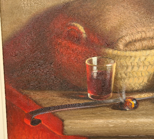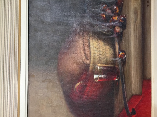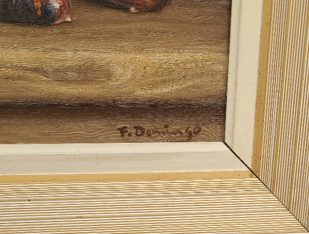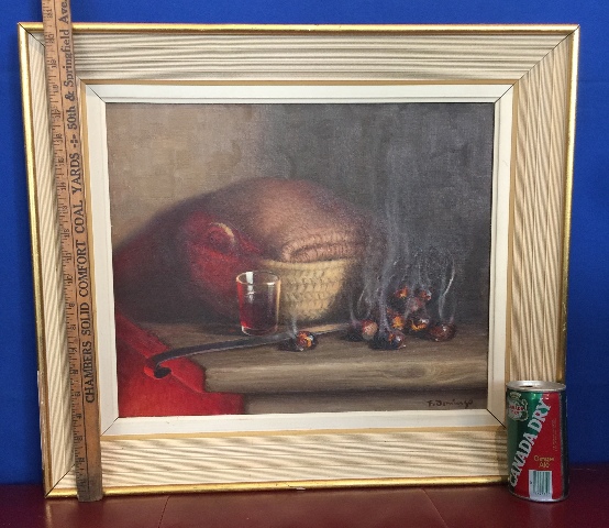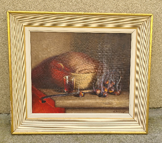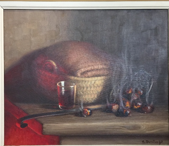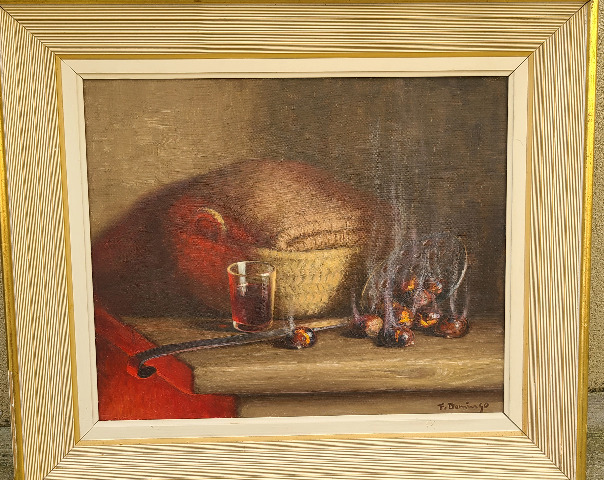 Gorgeous and incredibly detailed still life oil painting signed "F. Domingo" in the bottom right corner, done by Francisco Domingo Y Segura. This wonderful still life has great composition. Roasted chestnuts look like they were just removed from the fire, sitting on a large iron pierced flat ladle , a glass filled with wine sitting in front of a folded red/tan blanket in a basket on a table. What looks to be glowing light from a fireplace reflects on the wall behind them.