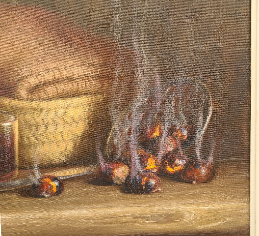 Vintage Realism Still Life Oil Painting Roasted Chestnuts -Steaming -Francisco Domingo Y Segura Art