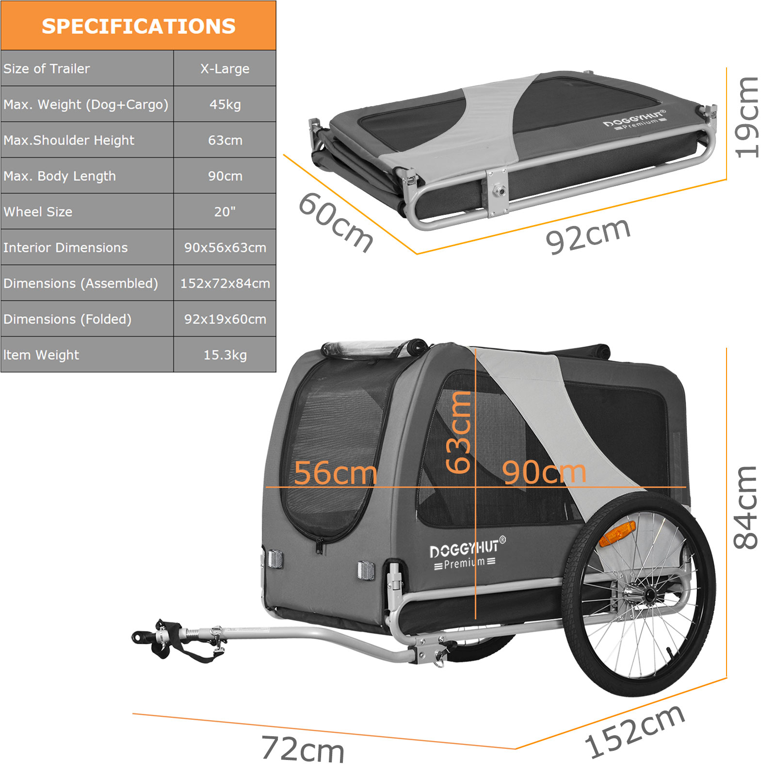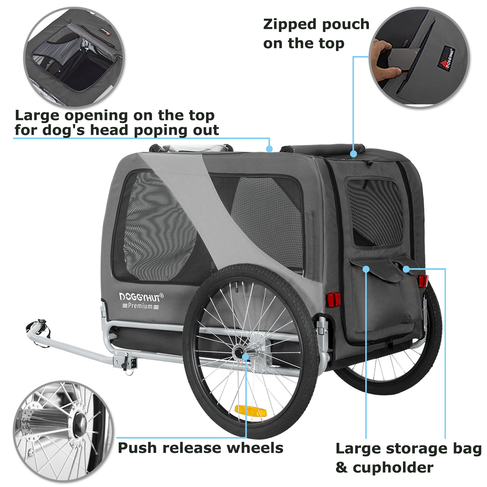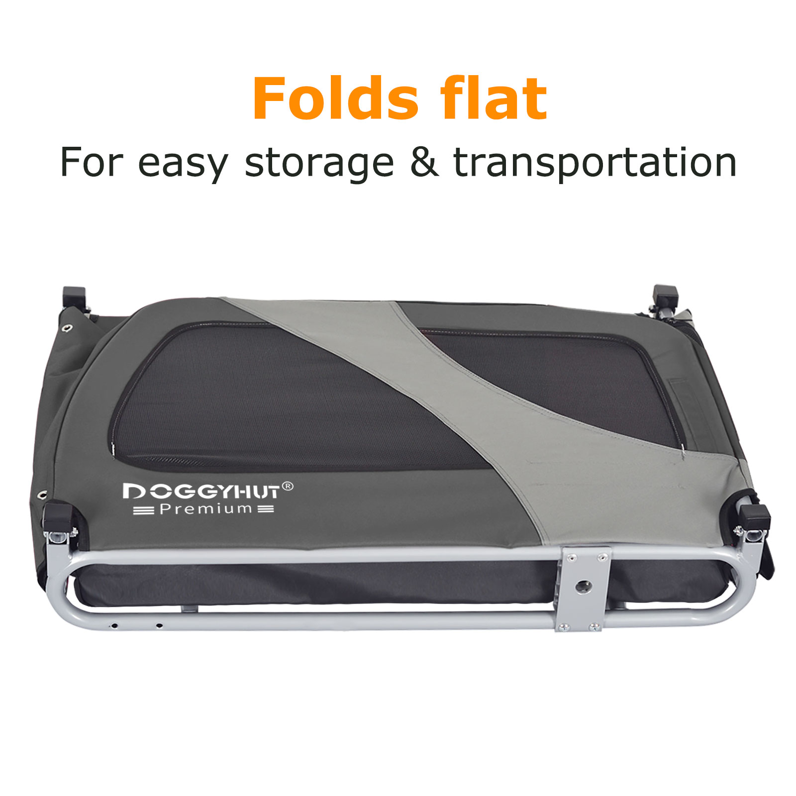 Der DOGGYHUT Premium XL Fahrradanhänger ist eine großartige Möglichkeit, einen aktiven Lebensstil mit Ihrem Haustier aufrechtzuhalten. Wenn Sie eine Radtour machen möchten, Ihr Haustier aber nicht dazu bereit ist, können Sie es trotzdem mitnehmen. Sie können den Anhänger auch zum Training zu Hause nutzen oder auch als Transportbox im Auto nutzen. Das Design von Doggyhut verfügt über einen extra breiten Radstand und einen niedrigeren Schwerpunkt, um eine hervorragende Fahrstabilität und einen leichten Zugang für Haustiere zu gewährleisten. Die Vorderseite des Anhängers besteht aus einer Netzabdeckung mit Reißverschluss und einer zweiten durchsichtigen Abdeckung als Regenschutz, um Ihr Haustier vor Wind und Wetter zu schützen. Die obere Öffnung mit Reißverschluss bietet ausreichend Lüftung. Der Anhänger lässt sich sehr schnelle zusammenbauen und zur Aufbewahrung und Transport einfach zusammenklappen.