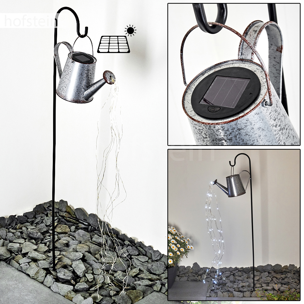 Besonderheiten: Die Leuchte verfügt über ein Solarpanel und einen eingebauten Akku mit einer Akkulaufzeit von ca. 6-8 Stunden.