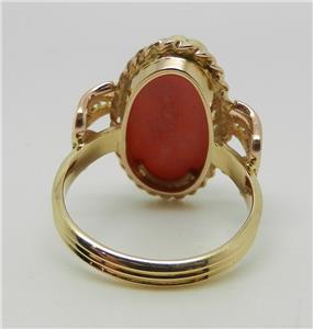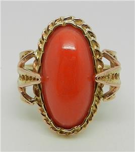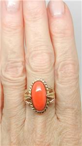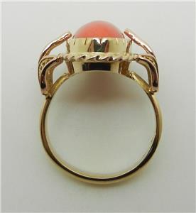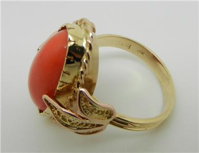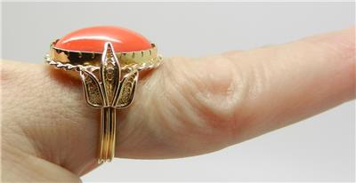 This beautiful ring is solid 18K yellow gold, stamped PB 18K the markings are a little worn but it has tested 18K and is guaranteed to be solid gold. The ring has a leaf design on the sides of the setting and has an oval natural salmon color coral stone. The ring can be resized by your local jeweler.