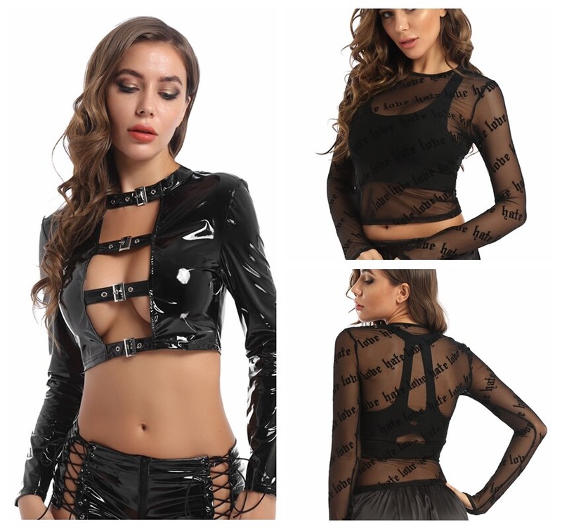 Women’s bra tops, wetlook fabric, wire-free underline, pull on closure.