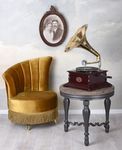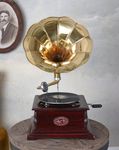 The vintage gramophone “VILLA GATSBY” combines artistic design and mechanical fascination: a square, finely hand-carved wooden casing is crowned by a polished brass funnel, which stylishly highlights the sound of the enclosed original shellac record. Complete with a box of replacement needles, this gramophone is not only a decorative highlight in the style of the Roaring Twenties, but is also fully functional. Simply wind the crank and the rustic spring mechanism begins to rotate - the warm, analog sound fills the room and takes you back to a time when music was created without a power source. Thanks to the easy assembly, the gramophone is ready for immediate use and does not require any electronics or hi-fi system. With compact dimensions of approx. Measuring 66 cm high, 42 cm wide and 42 cm deep, it fits perfectly on sideboards, shelves or side tables and gives any living area an authentic vintage ambience.