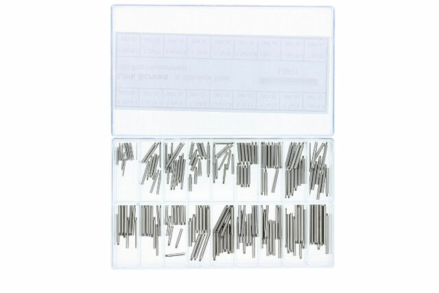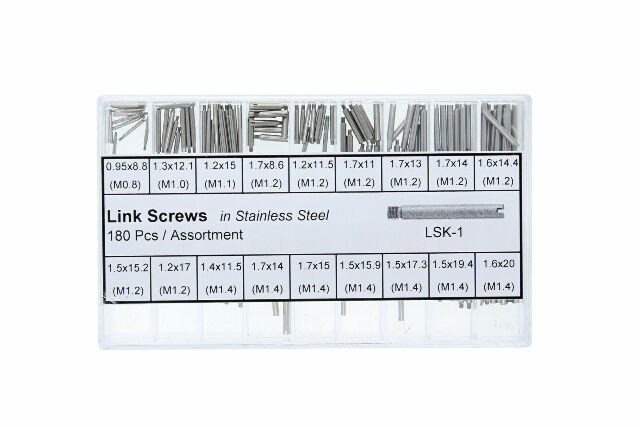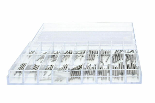 This set features 316L stainless steel screw pins, individually packaged and labeled by size, and stored in a clear acrylic storage case for organization and convenience.