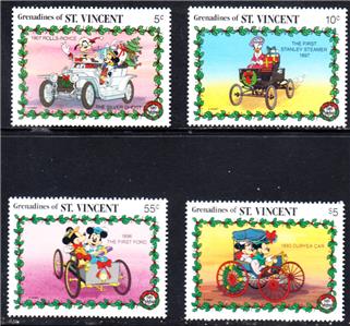 DISNEY CHARACTERS in ANTIQUE CARS on Set of 4 1989 CHRISTMAS Postage Stamps from the Grenadines of St. Vincent; Mint never hinged Excellent Condition