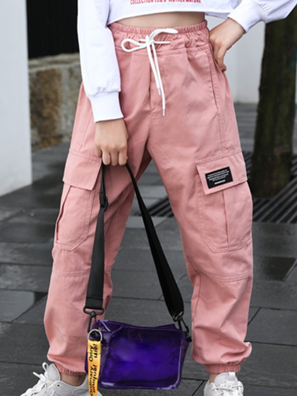 Pure color, elastic waistband with drawstring, 4 pockets, girls fashion cargo pants.
