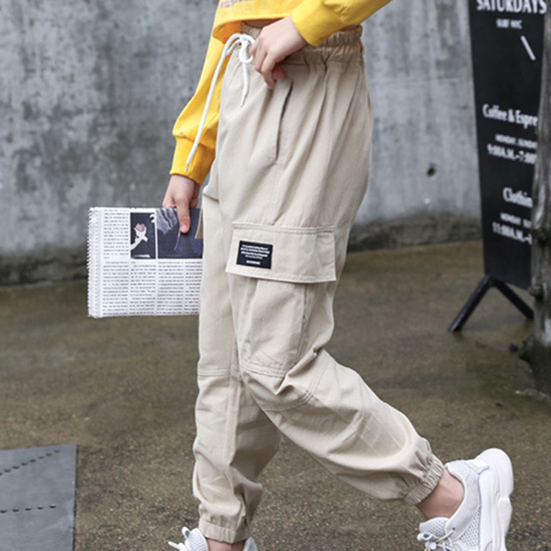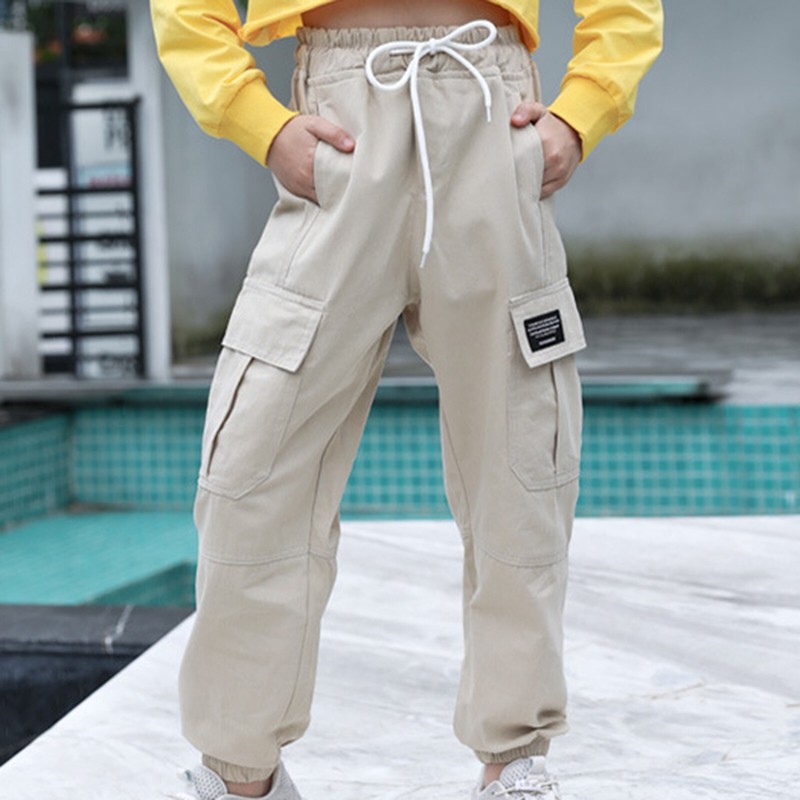 Girls Elastic Waistband Drawstring 4 Pockets Front Pants Trousers Cargo Pants.
