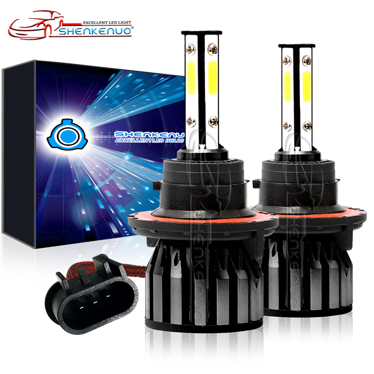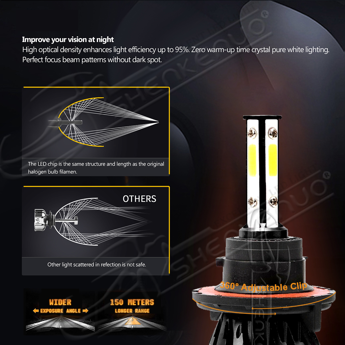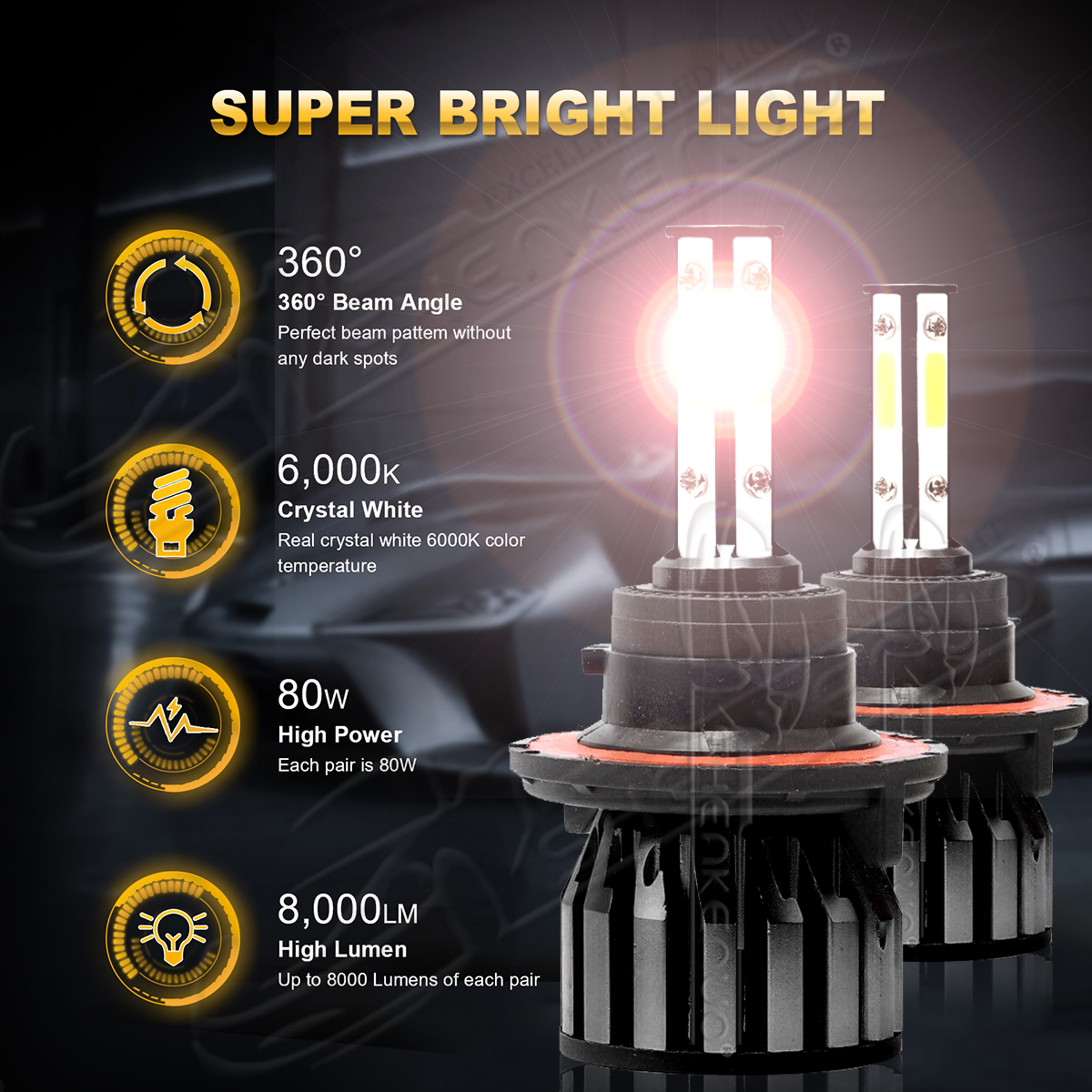 - 4 Side COB LED Bulbs, 360° clear light beam,on each side to provide more lighting effects in lower power consumption. It can be 200% brighter than your factory halogen bulb and more lighting effect in 80 wattages (per set).360° adjustable extremely beam pattern.