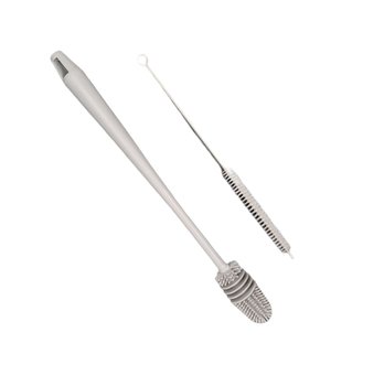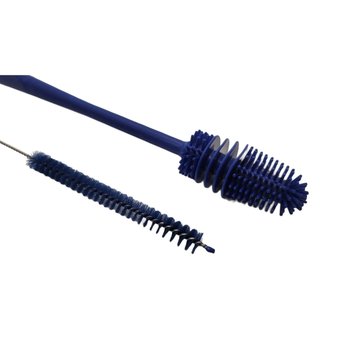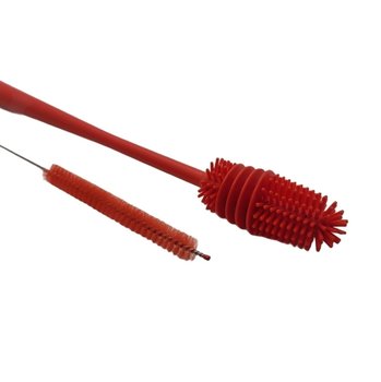 Made from durable BPA-free plastic (handle), silicone (bottle cleaning brush head), metal (straw brush handle) and nylon (straw brush bristles). Bottle brush measures 13" long overall with a cleaning head measuring 2.75" long. Straw brush measures 10" long overall with a bristle cleaning head measuring 4.5" long.