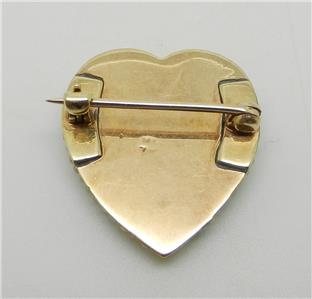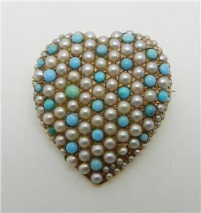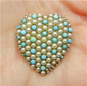 This beautiful pin brooch is yellow gold, the markings have worn off but it has tested 10K gold. The brooch is a heart with genuine turquoise and seed pearls that measures 1" in length and is rare and hard to find.