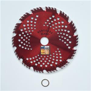 (1)--RENEGADE STANDARD BLADE Silver [RSB] Multi-Use: 8"-80t, 9"-100t,10"-120t.... a "thick wood limbs and hard bushes" specialty: Has the most teeth we offer, so best for cutting solid wood based material. Hard stock type bushes, trimming tree limbs & branches and root suckers, solid wood based material is this blade's specialty but it will also cut firm brush, but if you are cutting soft grassy wispy brush or bushes, then high teeth count blade like this one will tend to push the brush over instead of cutting it due to {not} having "grabbing cavities" between the teeth. High teeth count blades have more teeth per square inch to help avoid seizing in dense wood tree limbs while cutting. Additionally, this blade or the one below (red razor) are probably the best blade types for {hedging} rubbery material (fibrous vines) as low teeth count blades with big cavities tend to grab and tear instead of cutting rubbery vines (like ivy). This blade is our chain saw replacement with respect to cutting wood material. Large 5.5mm teeth coupled with the most carbide teeth per blade inch that we offer makes this a dynamo in its specialty. NOTE: These teeth offer high durability having slightly larger thicker teeth but may have slightly {more} friction than the blade just below (Razor).