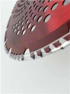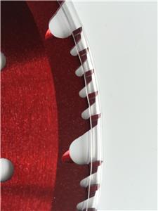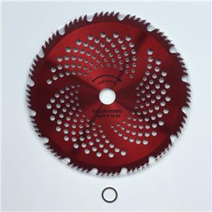 (3)--HYBRID Red RAZOR: 8"-56t, 9"-68t, 10"-80t.... "medium wood limbs & firm bushes specialty" plus brush & Brambles"... This blade that is in the middle between both of our 2 RSB - STANDARD blades, but with thinner smaller 4.5mm narrower low friction teeth and rounded sharpened cavities which is the only blade we know of that has both of these unique attributes. It really {does it all} quite well... This blade combines the characteristics of both our RSB blades just This blade offers our smallest narrowest 4.5mm teeth for ultra low friction (low seizing) but will power through branches up to "3-4" thick and also hedge rubbery ivy vines with the sharpened cavities. Truly a one of a kind blade that can handle most any job. The teeth on this blade cut with less friction but may have a slightly less durability than our bigger teeth blades depending on what is being cut. The Red Razor is primarily suited to Wood Cutting but also Brush & Brambles... as compared to our green VIPER that is primarily tailored to Brush & Brambles but also some wood cutting, due to teeth and cavity counts of both blades.