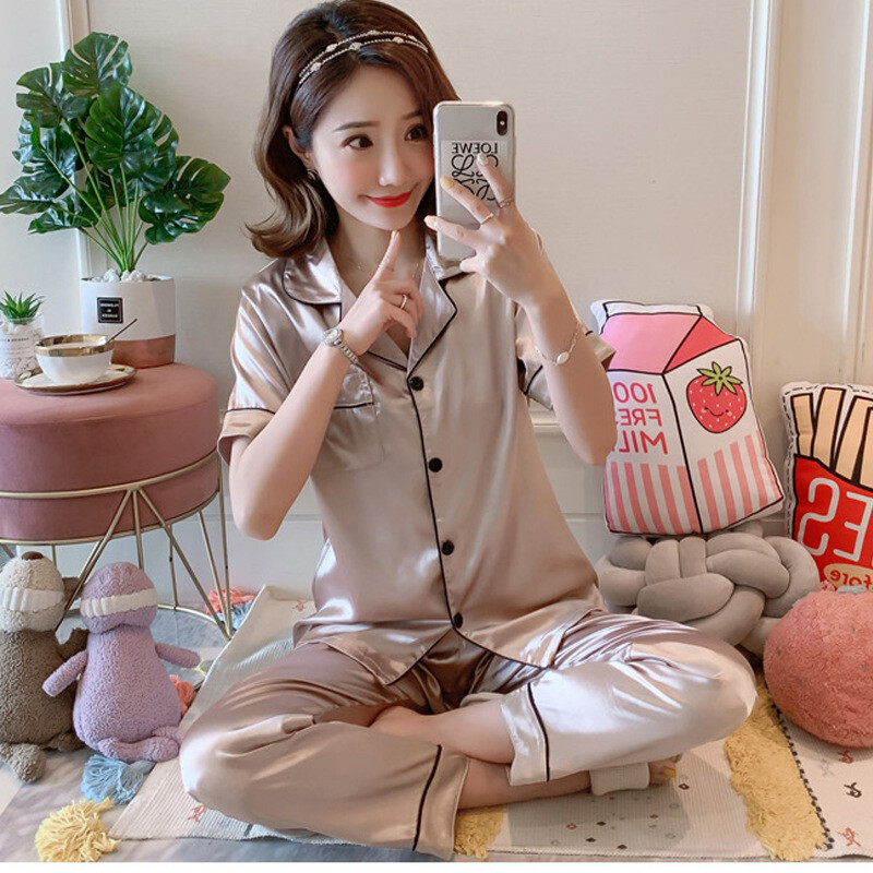 Womens Silk Satin Pajamas Set Ladies Short Sleeve Sleepwear Loungewear Nightwear