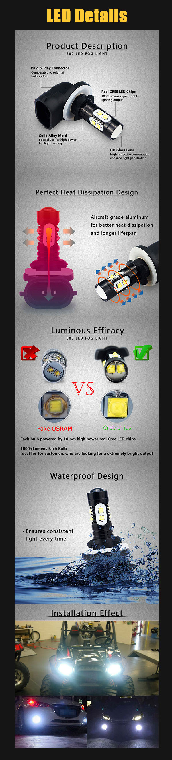 881 886 889 894 896 898 Specifications: -Aftermarket 100% Brand New -Base: 881 -Voltage:DC12V-24V -Beam Angle:360° -lumens:12000lm -Power;100W/Set;50W/Bulb -Color:6000K Super White -LED Type: LED chip high power -Beam Type:360° Beam Angle , No High Or Low Beam -Ultra Bright LED, unique and more vivid color -Low Power Consumption and Low Temperature -Long-lasting Life 50000 hours -Easy installation, just plug & play -Faster on/off response time and vibration resistant Socket: 881,881L,881X,889,862,894,894X,896,898,886,888, etc. Package Include: 2pc 881 LED Bulb