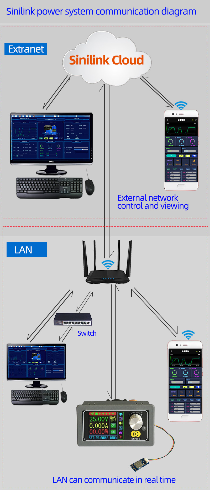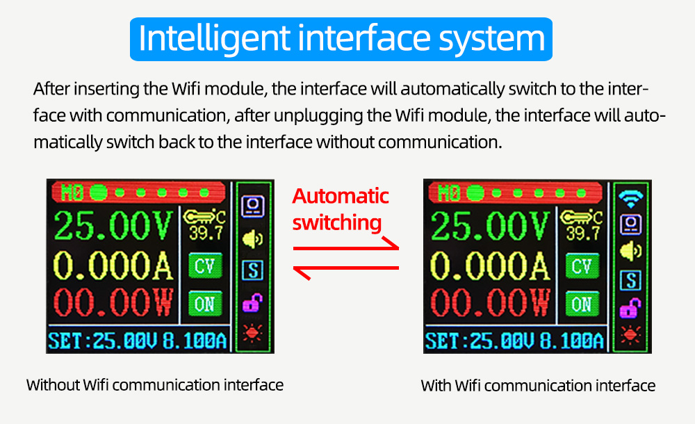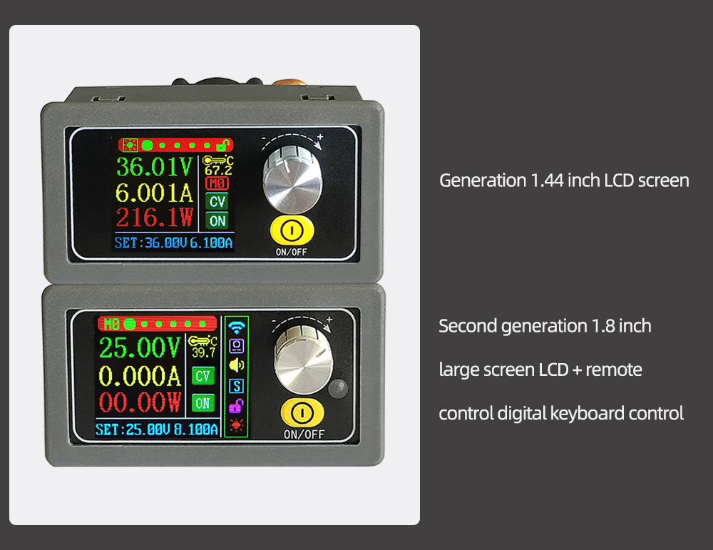 It integrates analog adjustment and digital control, and shows the preset voltage/current/power and so on in real time.