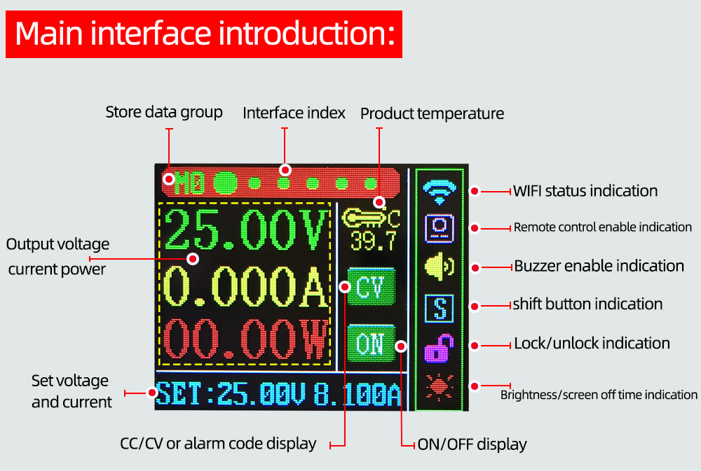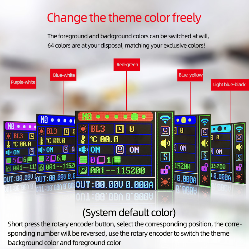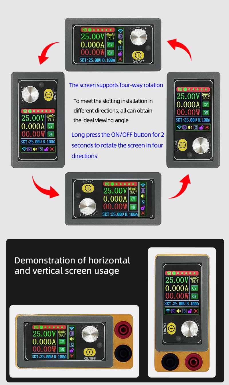 Short press the "ON/OFF" button to turn on and off the power output, long press the " ON/OFF" button for 2 seconds, the screen can rotate, 360 °four-way rotation.Turn the encoding potentiometer to turn the page quickly.