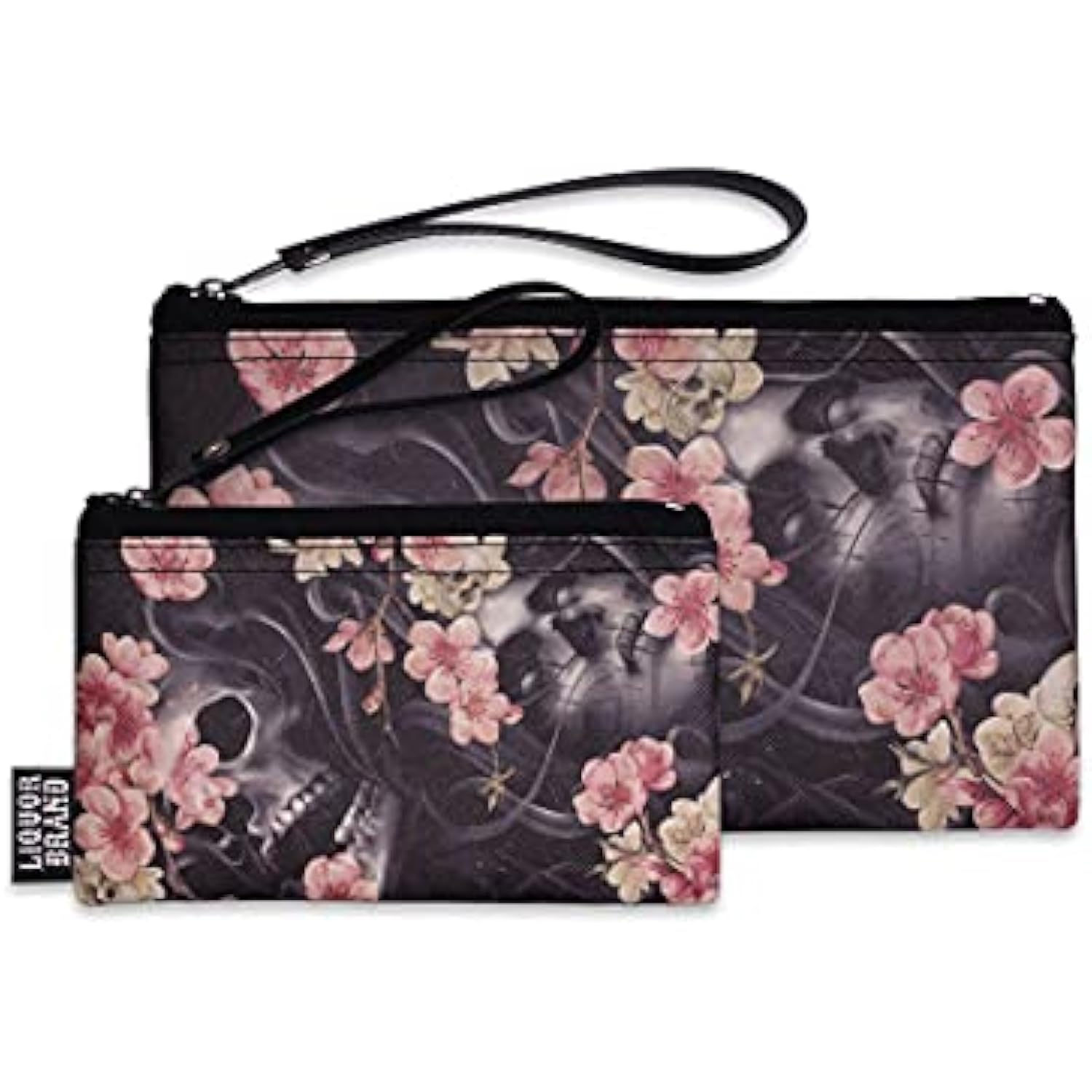 Liquorbrand Pink Flowers and Skulls Dia De Los Muertos Wristlet Pouch Bag and Coin Purse Set