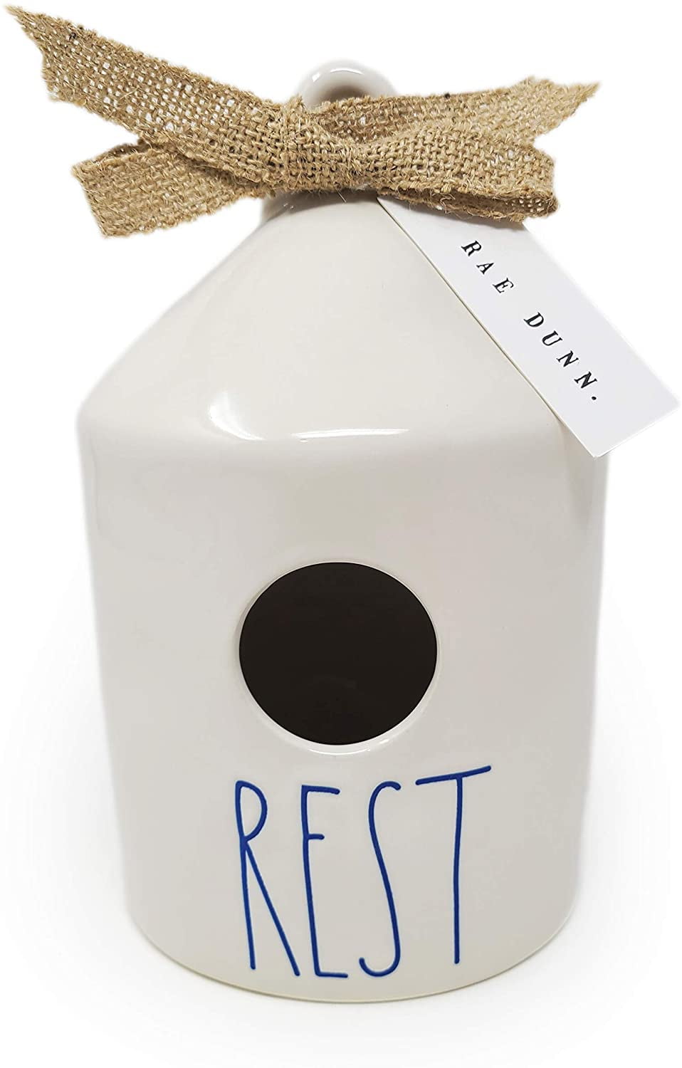 RAE DUNN BY MAGENTA Rest Ceramic LL Decorative Round Birdhouse With Burlap Ribbon With Blue Letters