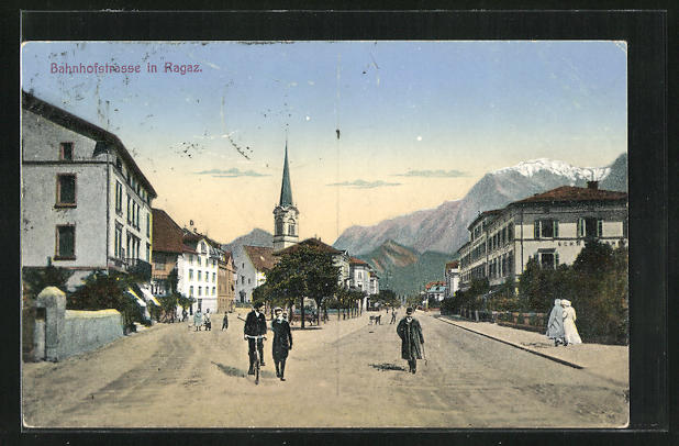 AK Ragaz, Bahnhofstrasse mit Blick gegen die Kirche, Radfahrer und Fußgänger